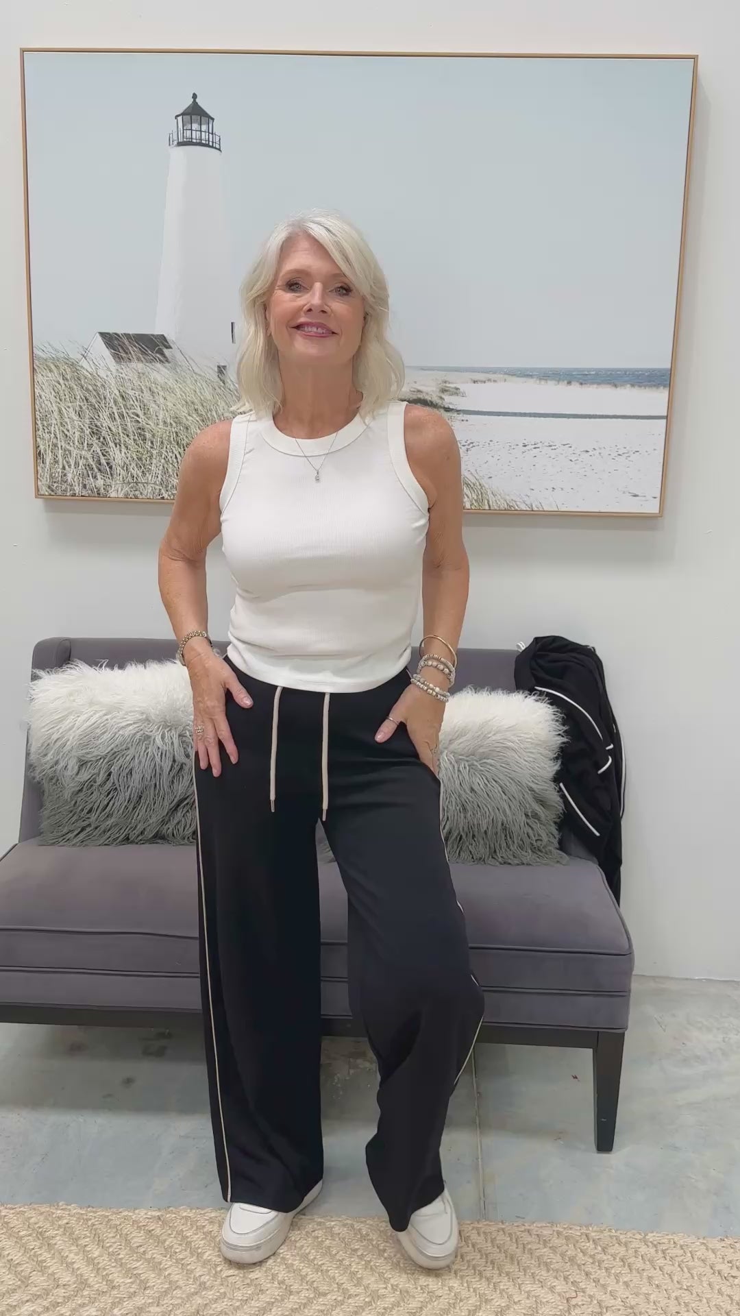 Featuring a loose, drapey fit with contrast piped side seams, a flattering drawstring waist, and practical pockets, the Addison Pant was made to move with you—whether you're heading out for errands, lounging at home, or walking to your local café.