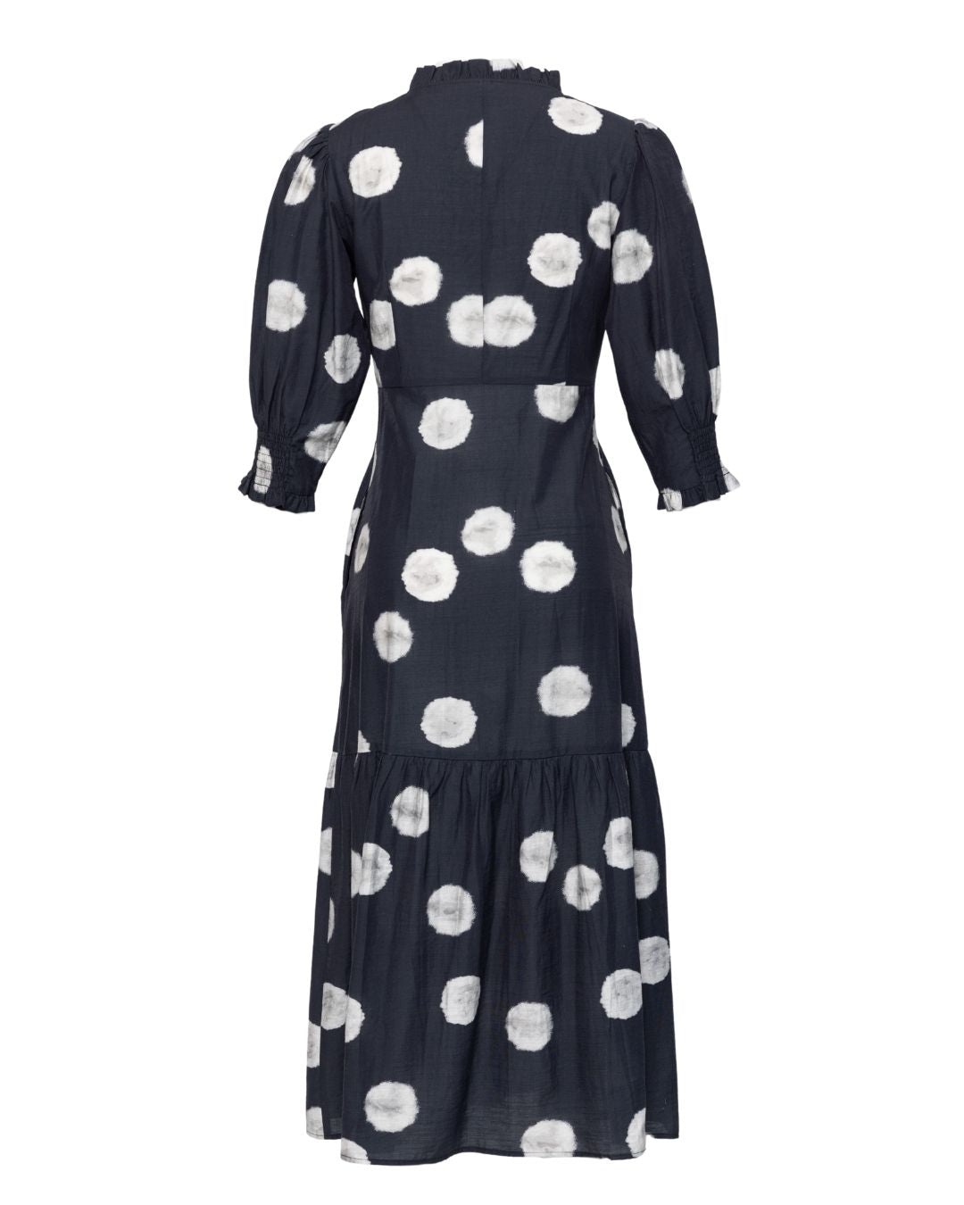 • Tiered midi dress with a V-neckline with a slightly ruffled standing collar. • ¾ balloon sleeves, and a gently gathered skirt for an easy, flowing fit. • It features an eye-catching, all-over white extra-large dot pattern on a dark background. • The dress is made from a blend of Rayon, Tencel, Linen, and Nylon, and is available in sizes 8-20.