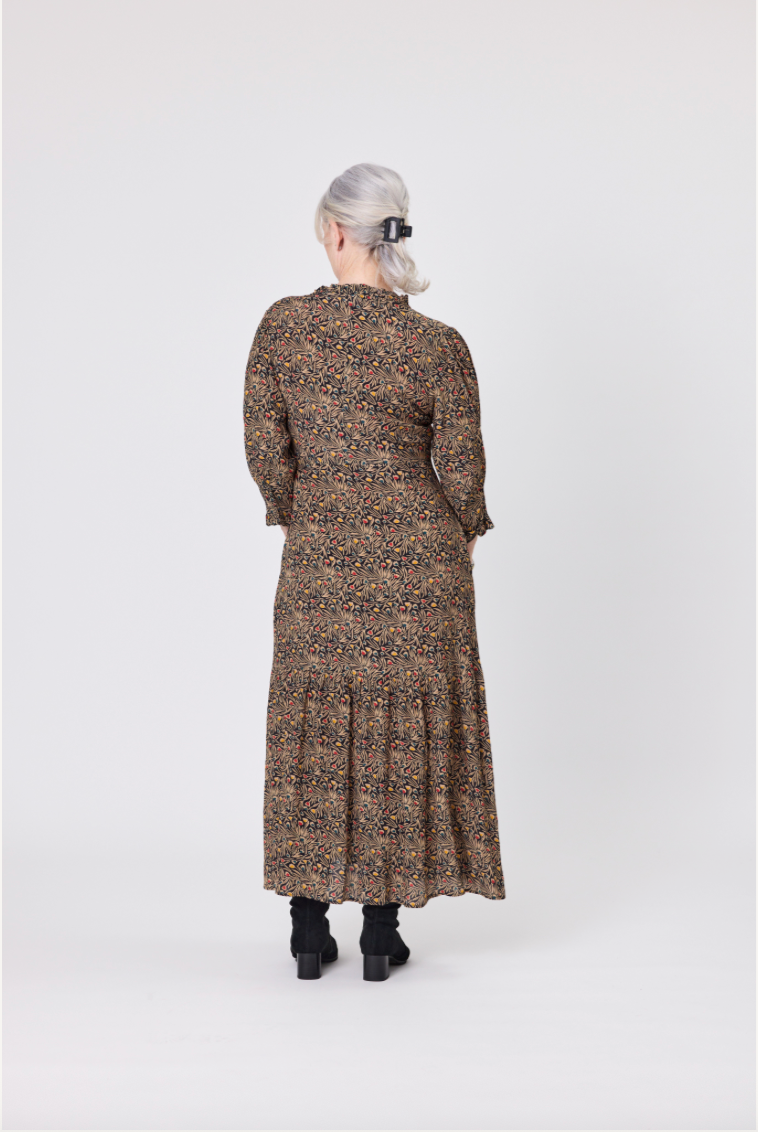 • Tiered midi dress with a V-neckline with a slightly ruffled standing collar. • ¾ balloon sleeves, and a gently gath...