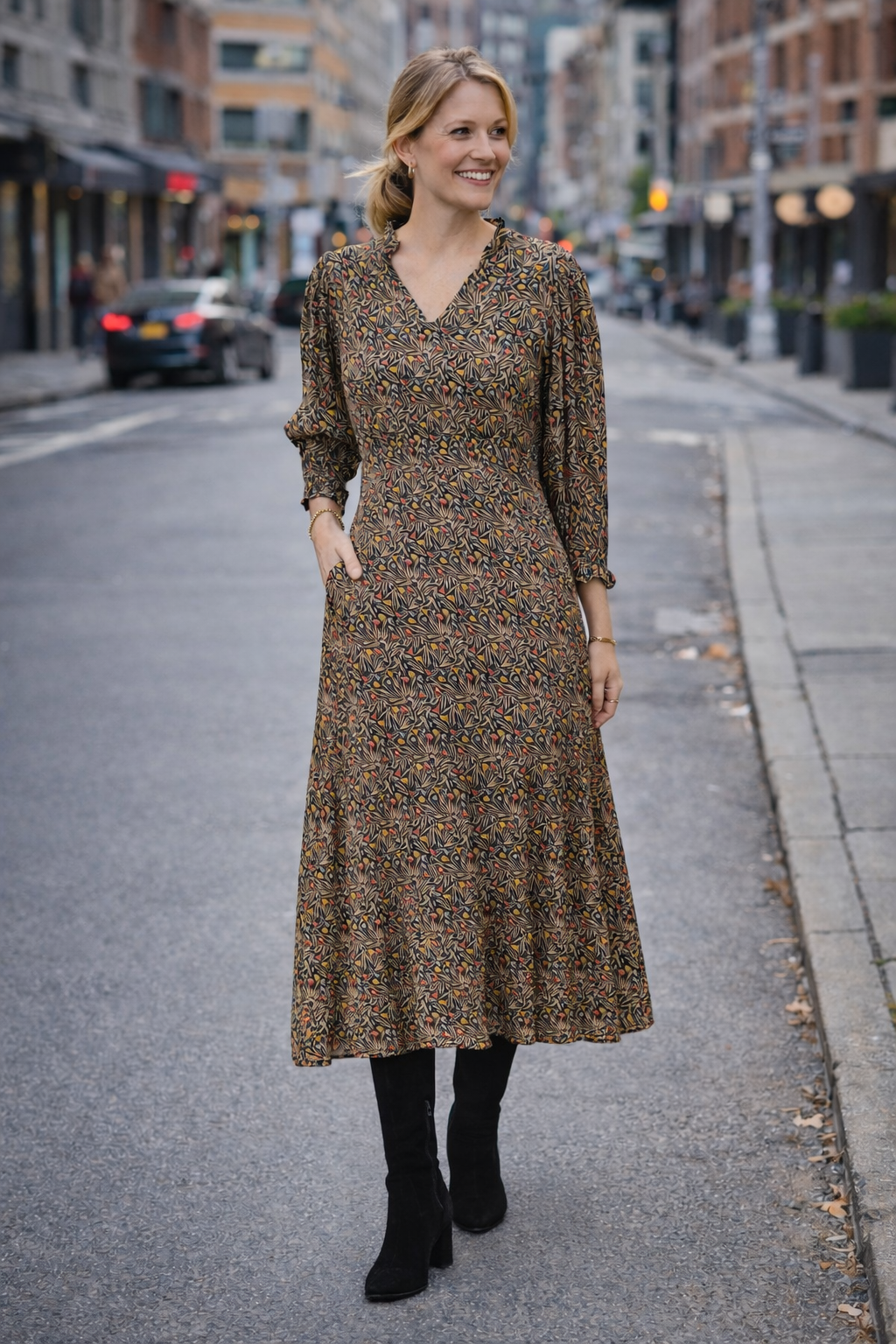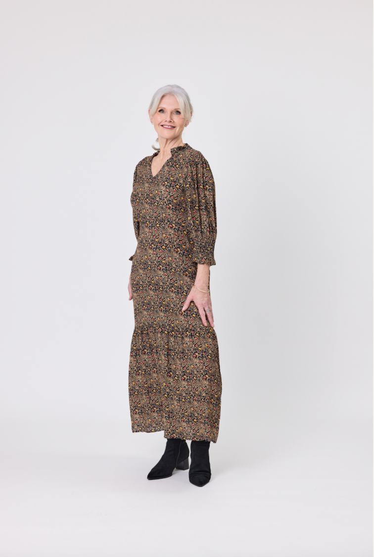 • ¾ balloon sleeves, and a gently gathered skirt for an easy, flowing fit.