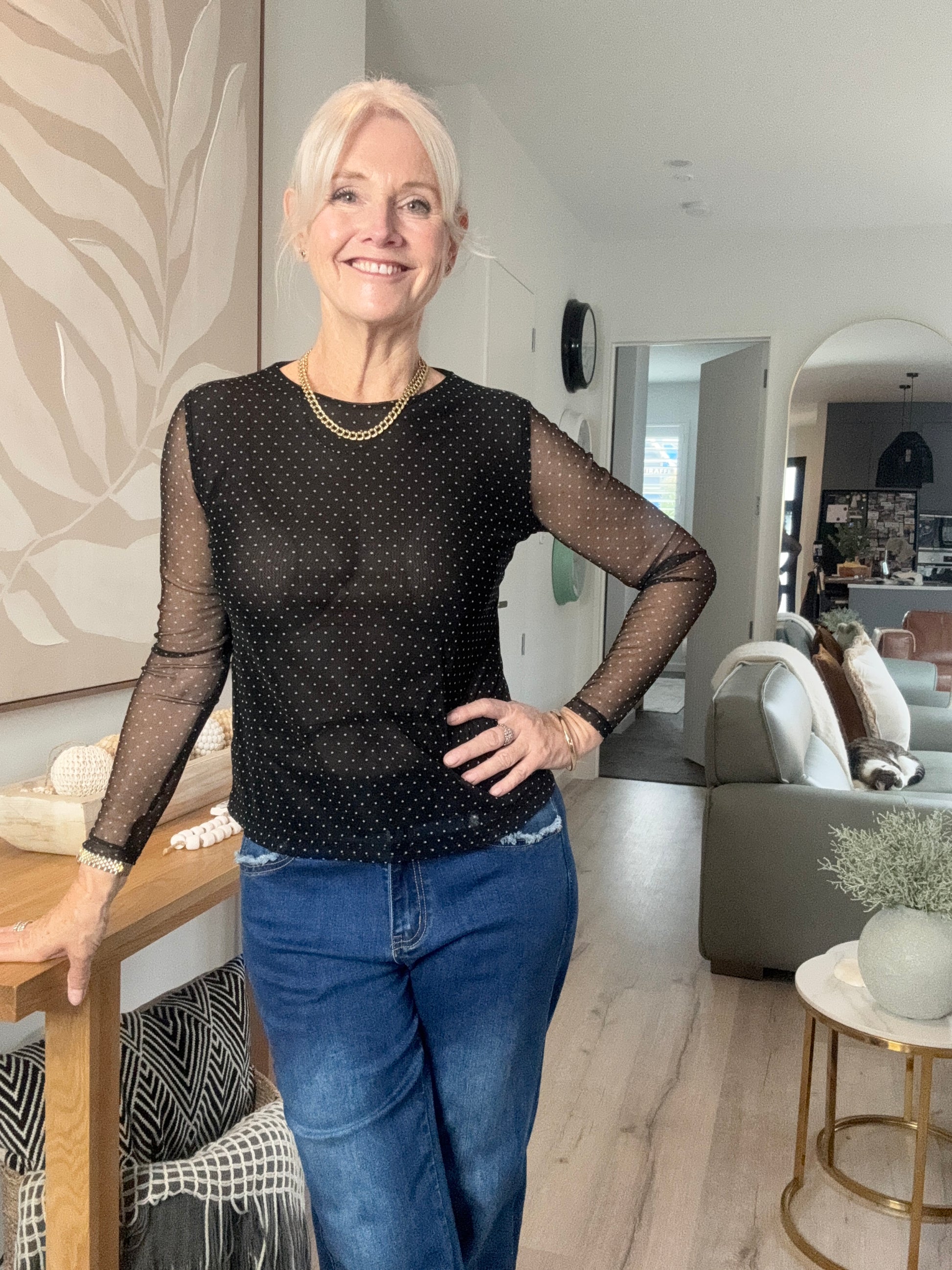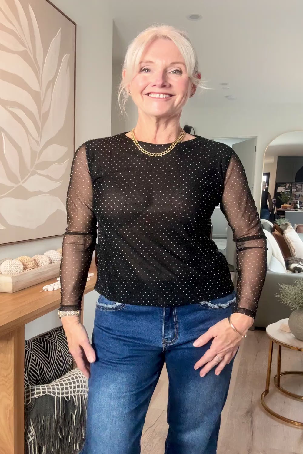 • Long sleeves with sheer detailing for a chic, elegant touch.
