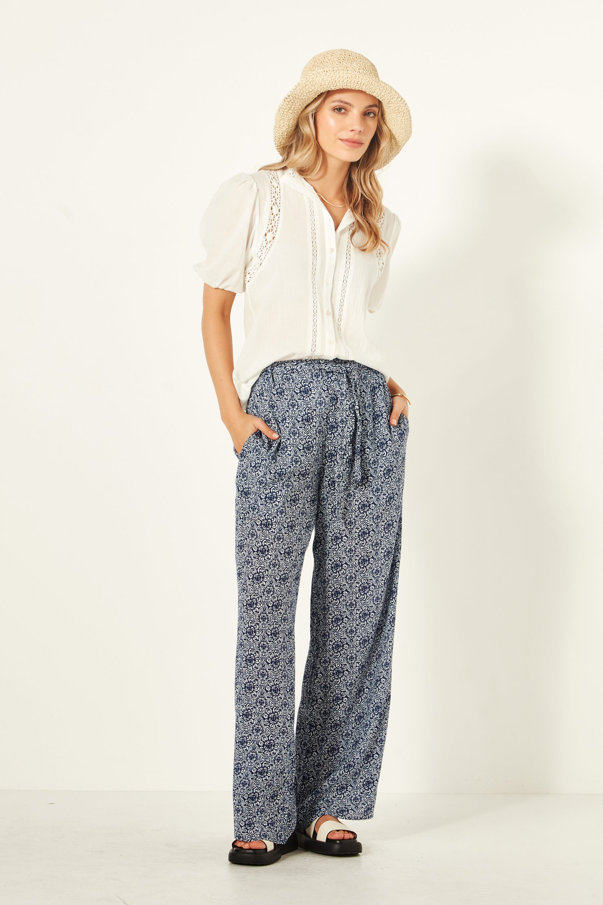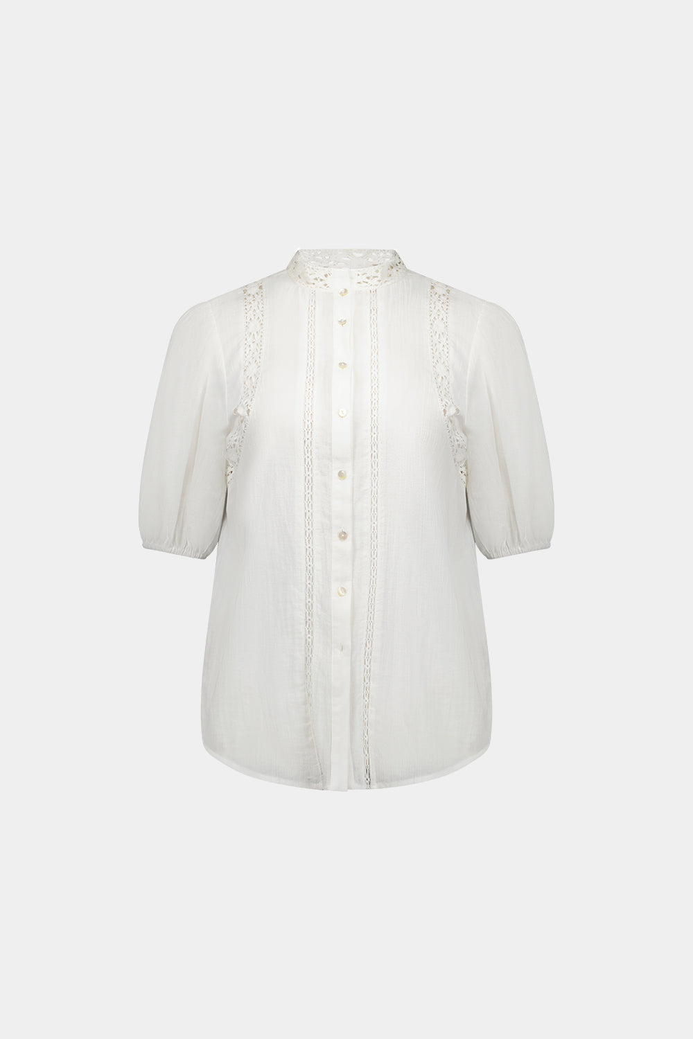 In this pure cotton blouse, comfort meets romance. Its loose fit allows freedom of movement, while delicate cotton lace inserts add a touch of charm. Fastened with mother of pearl buttons, each closure whispers of timeless elegance.