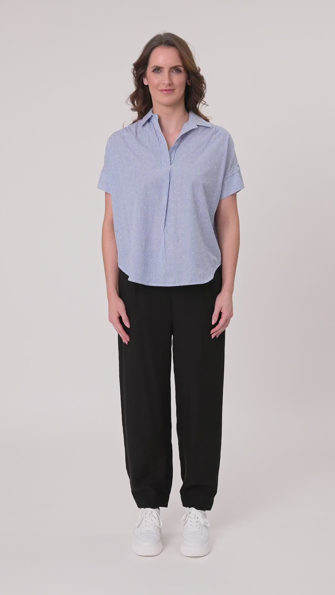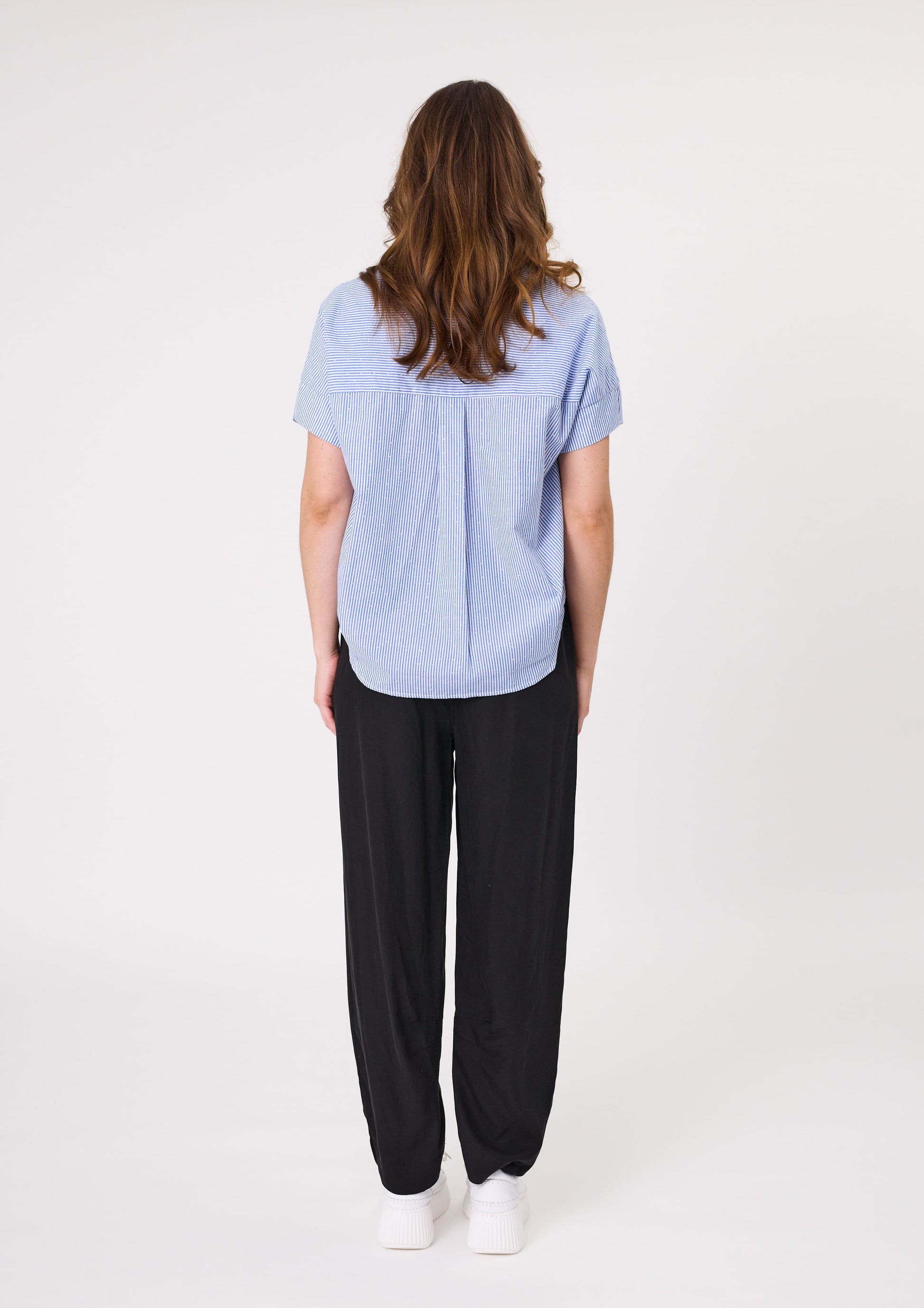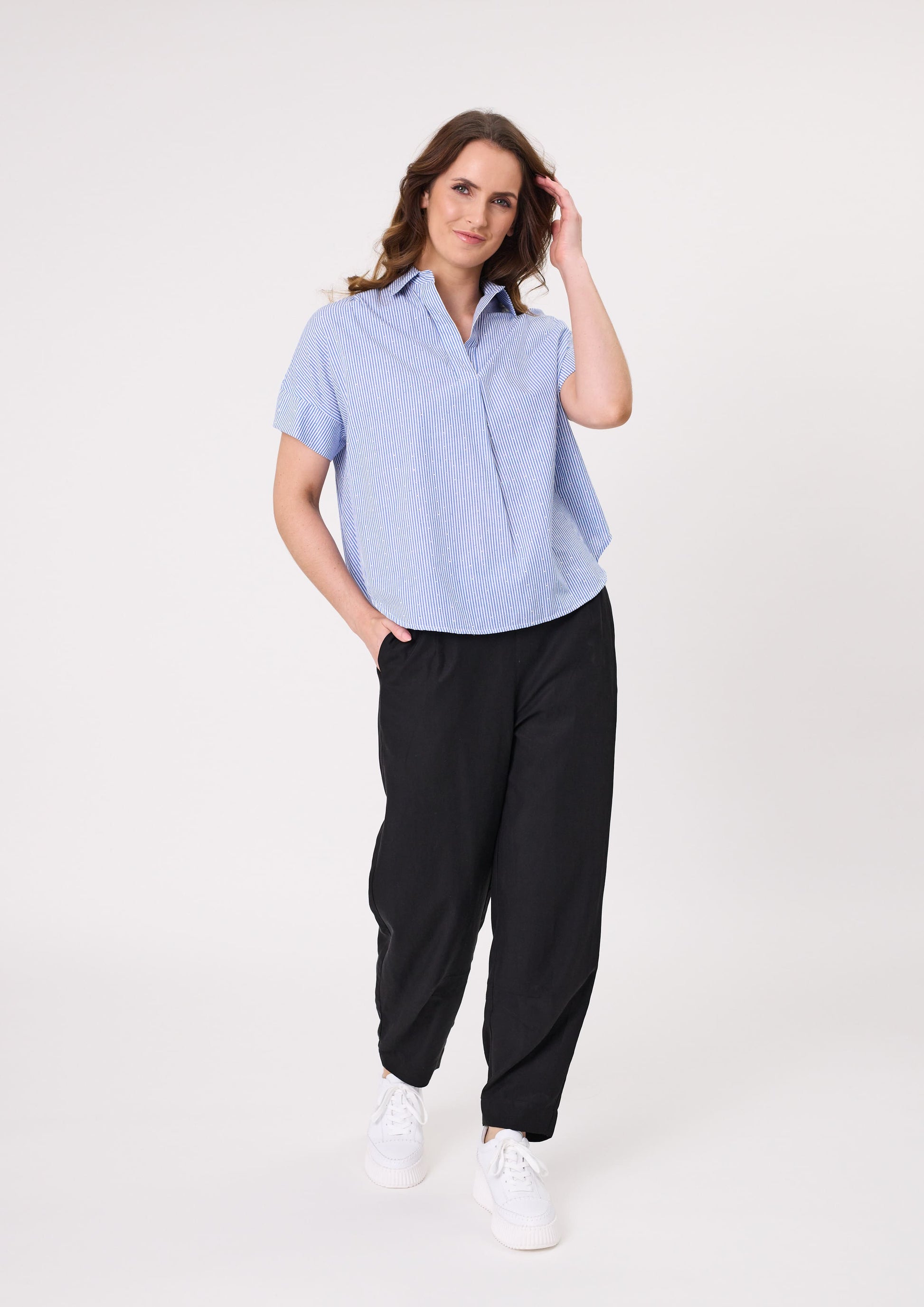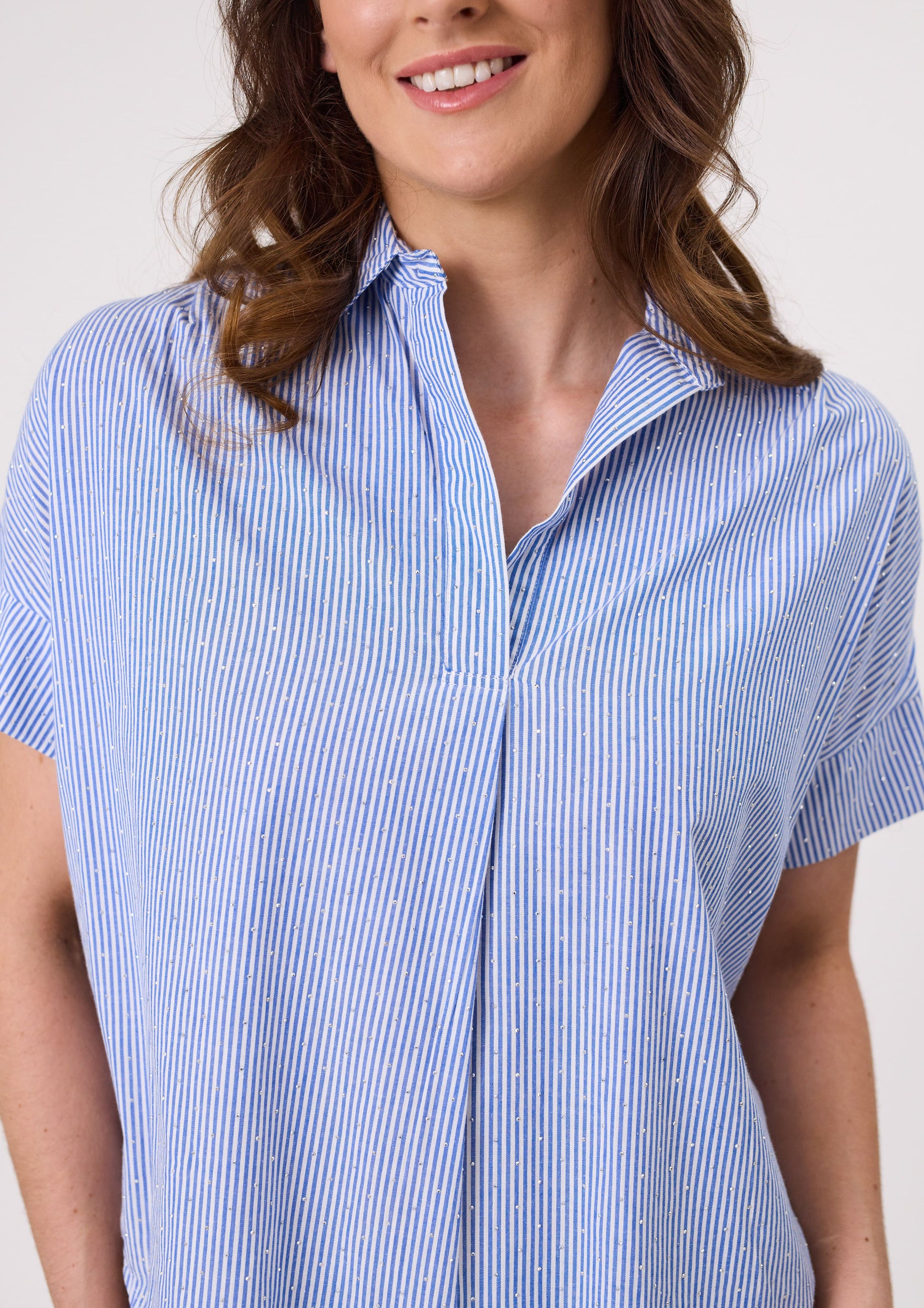 Dora Top with blue and white vertical stripes, light diamante detailing, and a classic collar, made from 100% cotton.