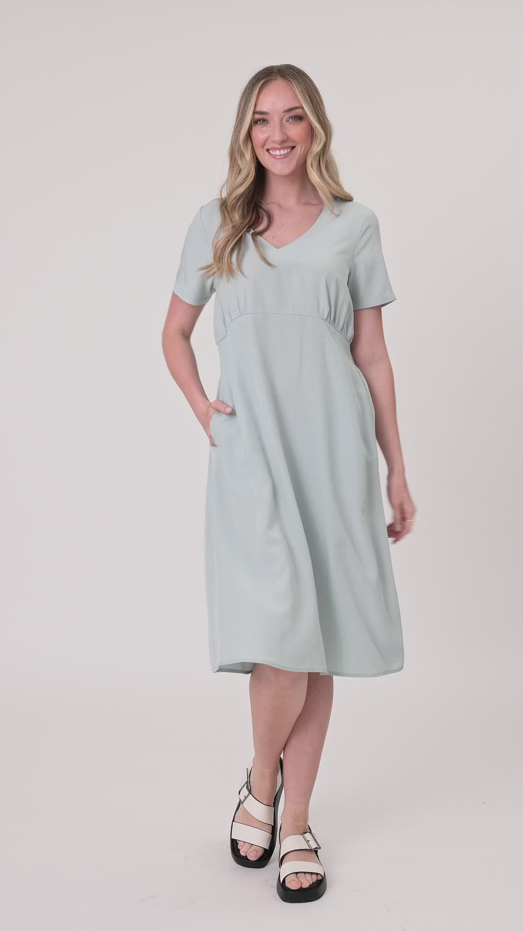 Emilia Dress in aqua with a V-neckline, short sleeves, gentle gathers under the bust, and a knee-length silhouette, made from a soft, breathable Tencel-linen blend.