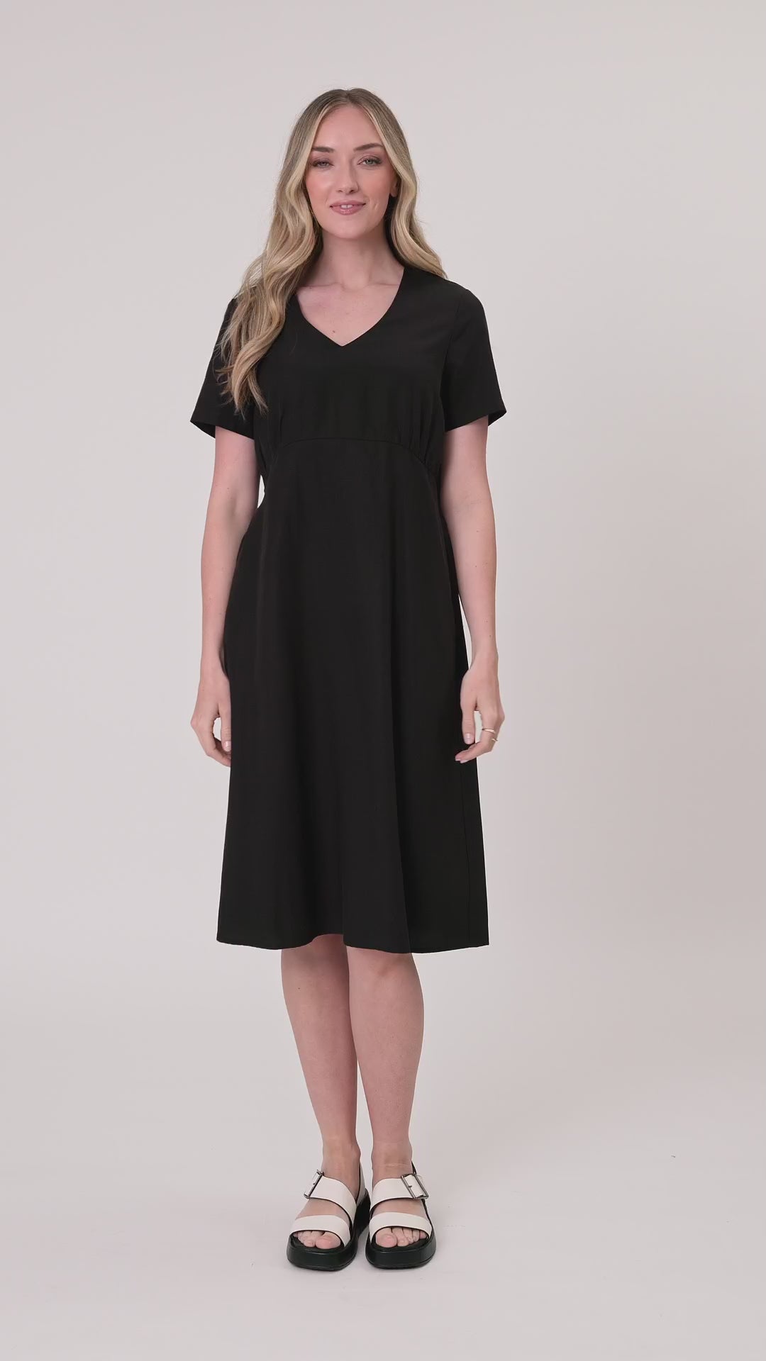 Emilia Dress in black with a V-neckline, short sleeves, gentle gathers under the bust, and a knee-length silhouette, made from a soft, breathable Tencel-linen blend.