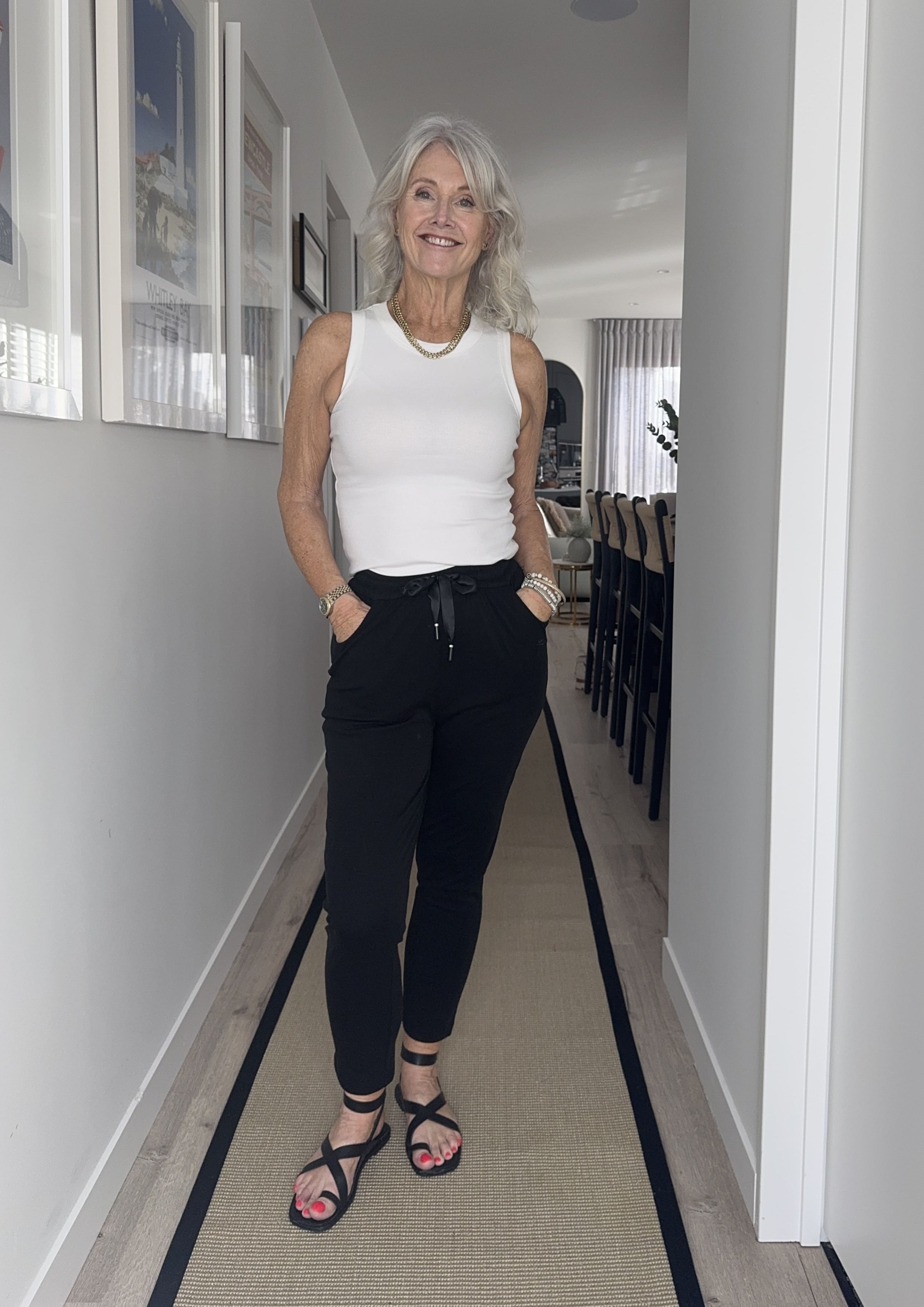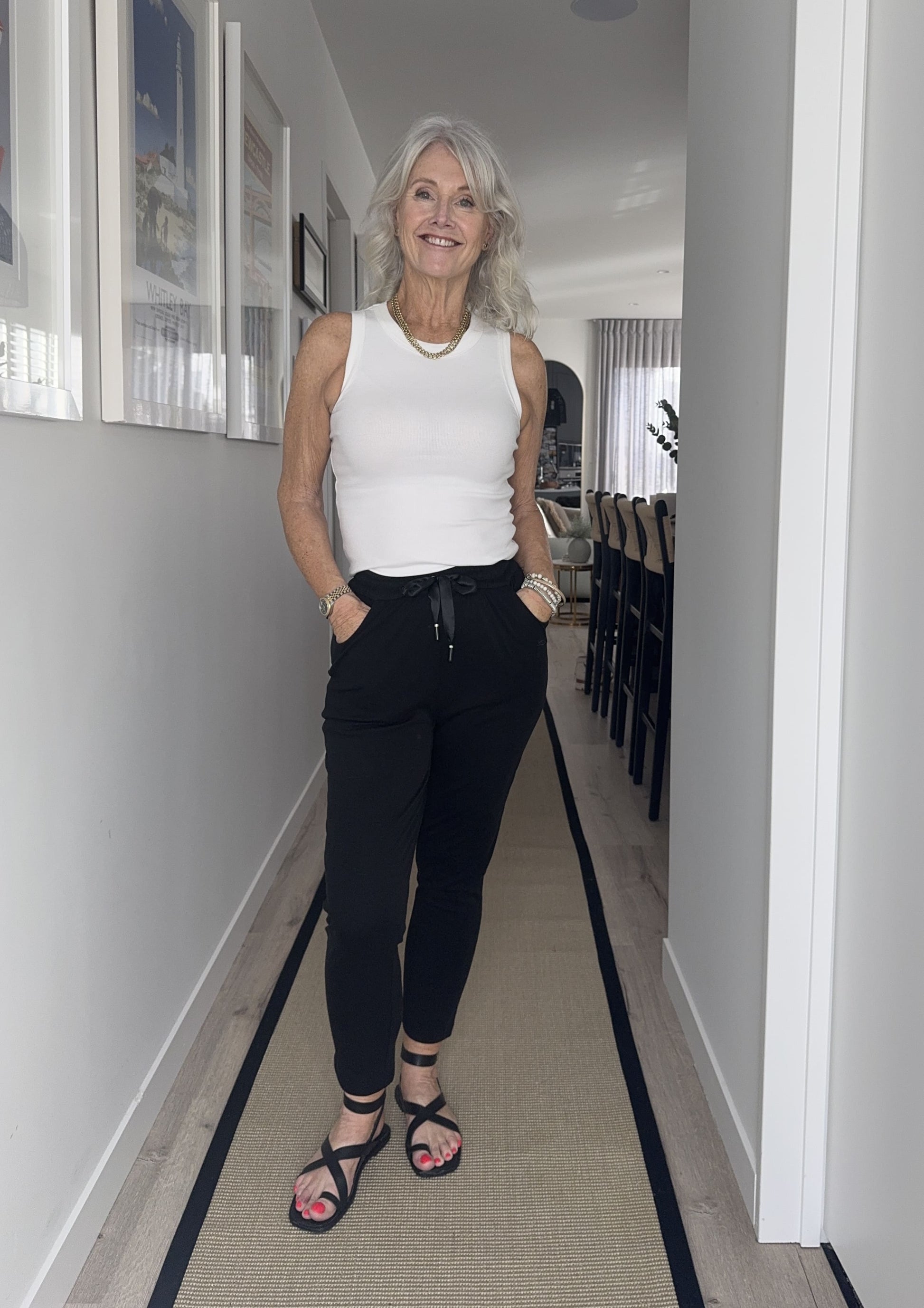 Gemma Pant in black with a slim, ankle-length cut, elasticated waistband with satin ties, and side and back pockets, made from a soft cotton-viscose blend.