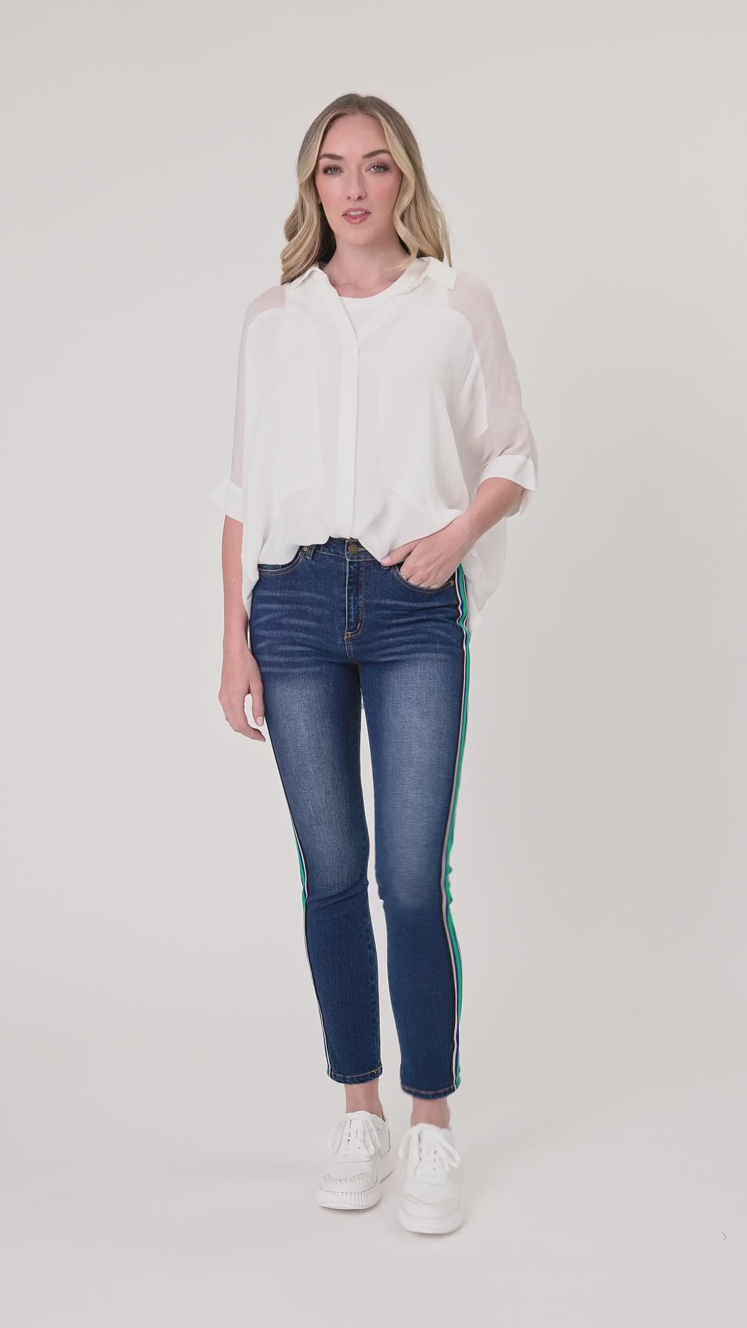 Sheer short-sleeve blouse in white with front buttons and a high-low hemline.