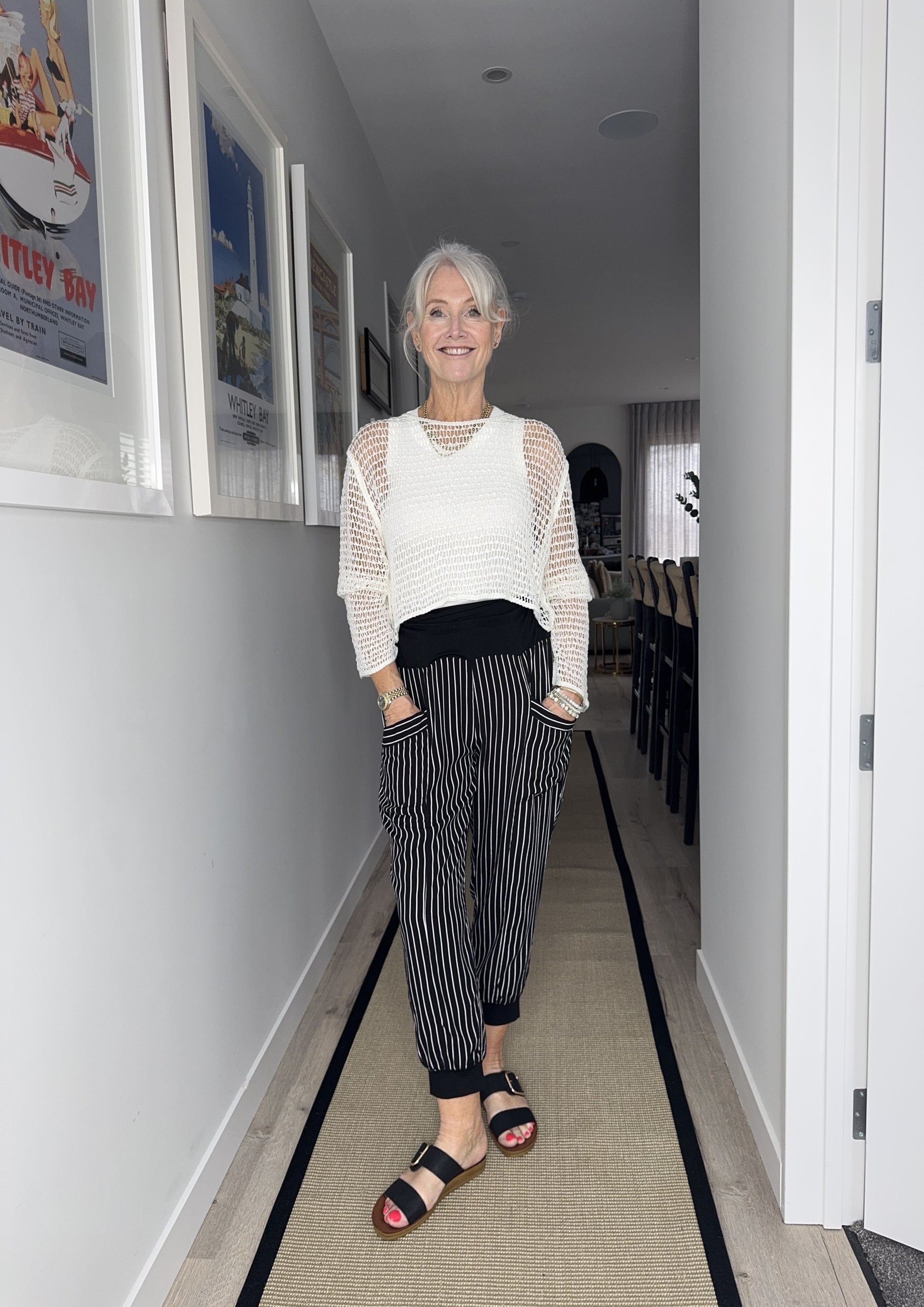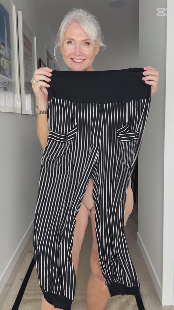 Harem Pant in black and white stripe, with a loose fit, cropped length, and side pockets, made from a lightweight, breathable viscose blend.
