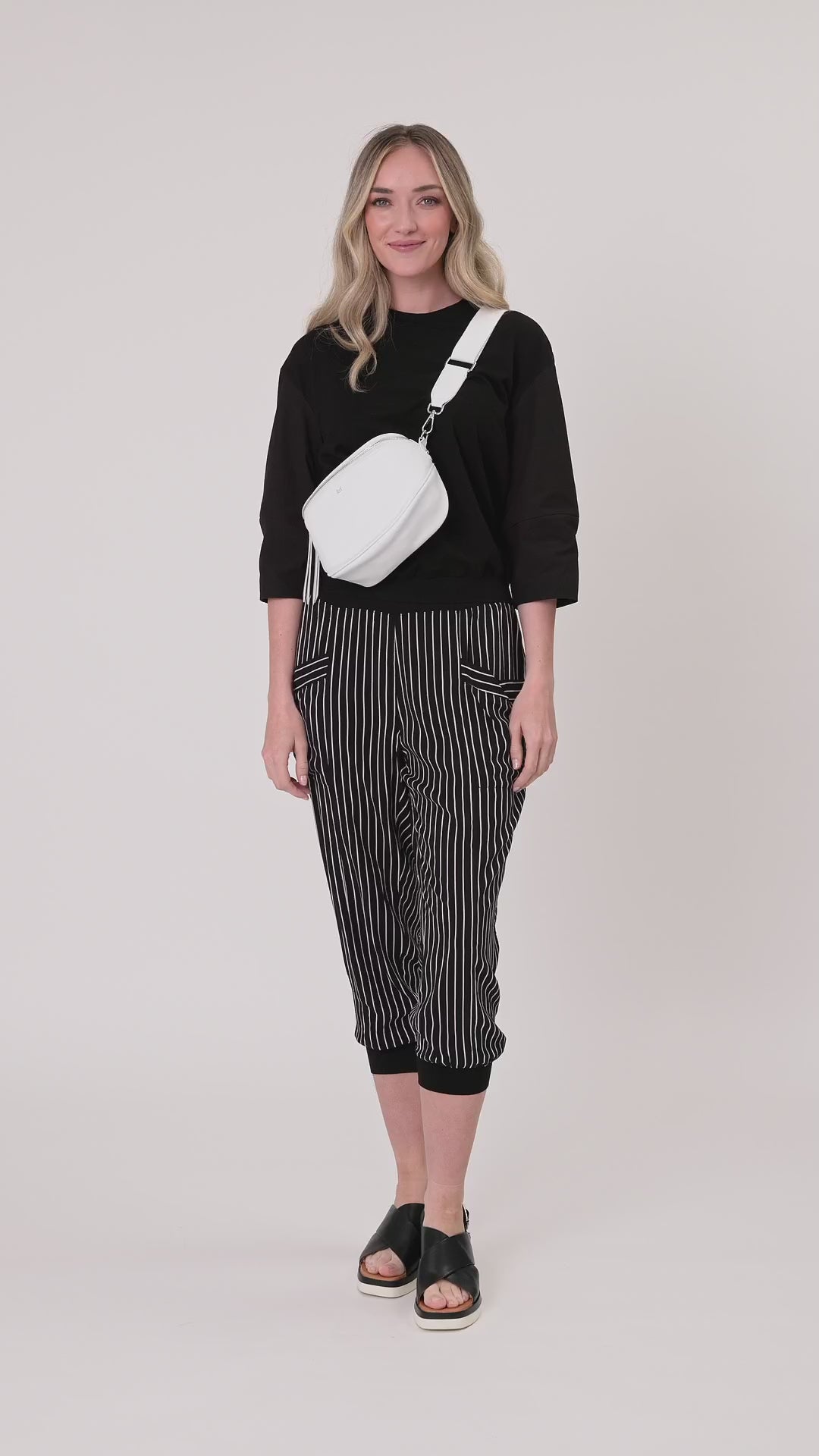Available in black & white stripe or solid black in a soft viscose blend. Loose fit with cropped length and side...