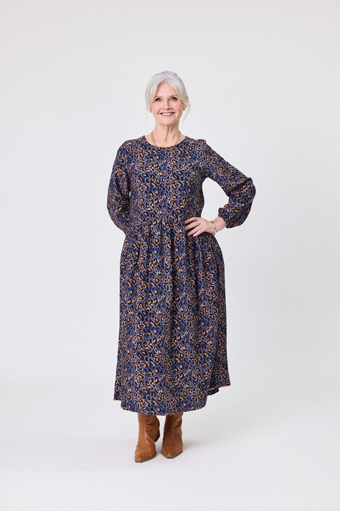 • Midi lenght dress with long, voluminous sleeves with elasticated cuffs. • A simple round neckline, and a gathered and curved waistline for a flowing, comfortable fit. • It features an understated all-over animal print, and comes with side pockets. • The dress is made from a soft Rayon/Viscose blend, is available in sizes 8-20.