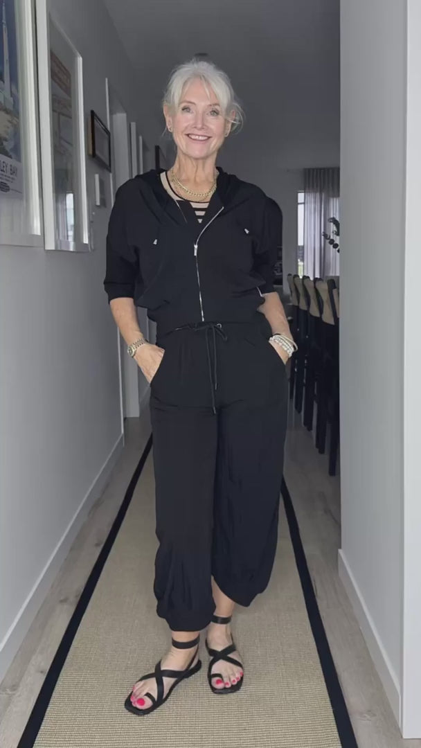 Larissa Pant in black with a relaxed, loose fit and three-quarter length, featuring a drawstring waistband and side pockets, made from a soft, breathable viscose-nylon blend.