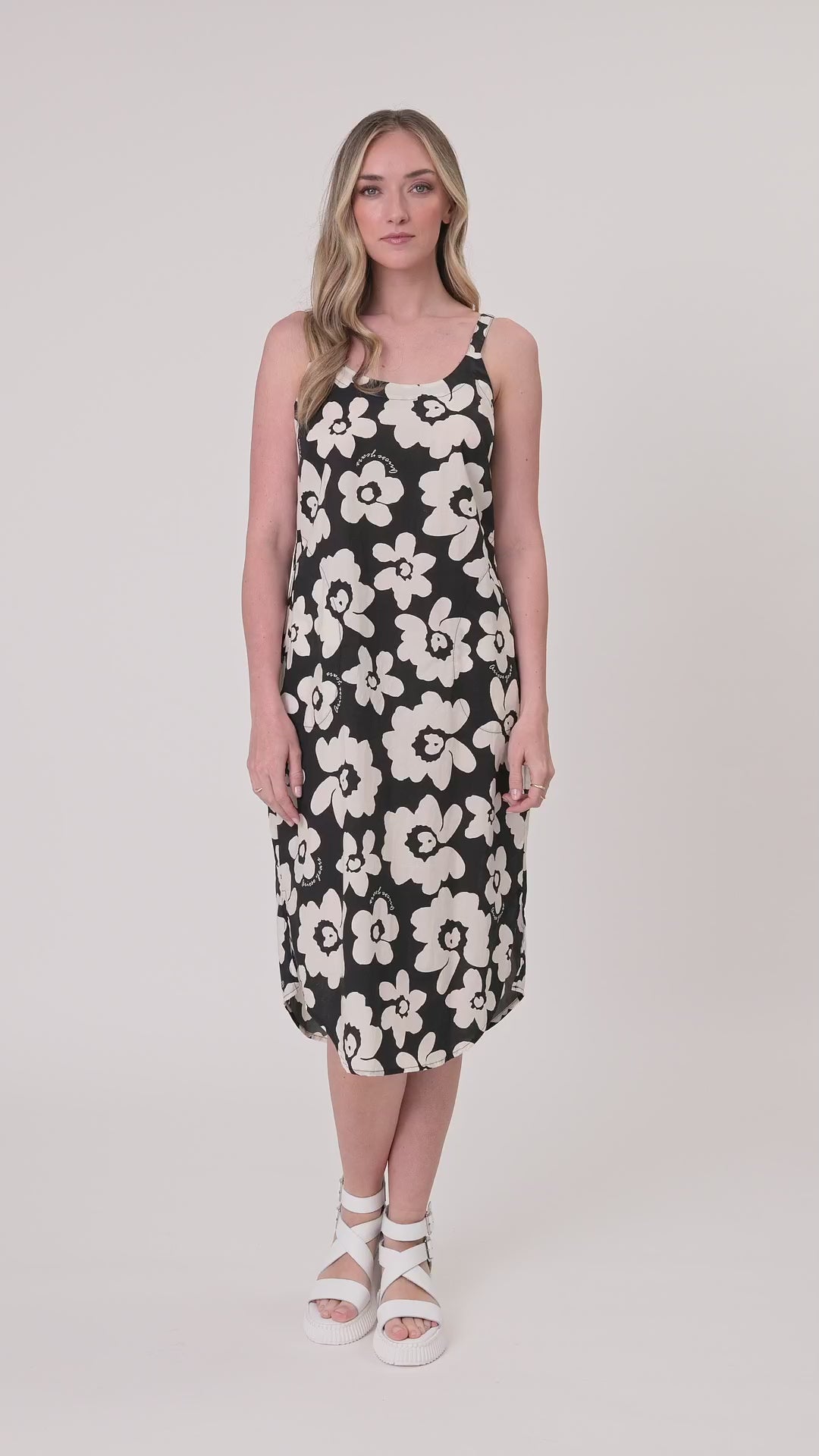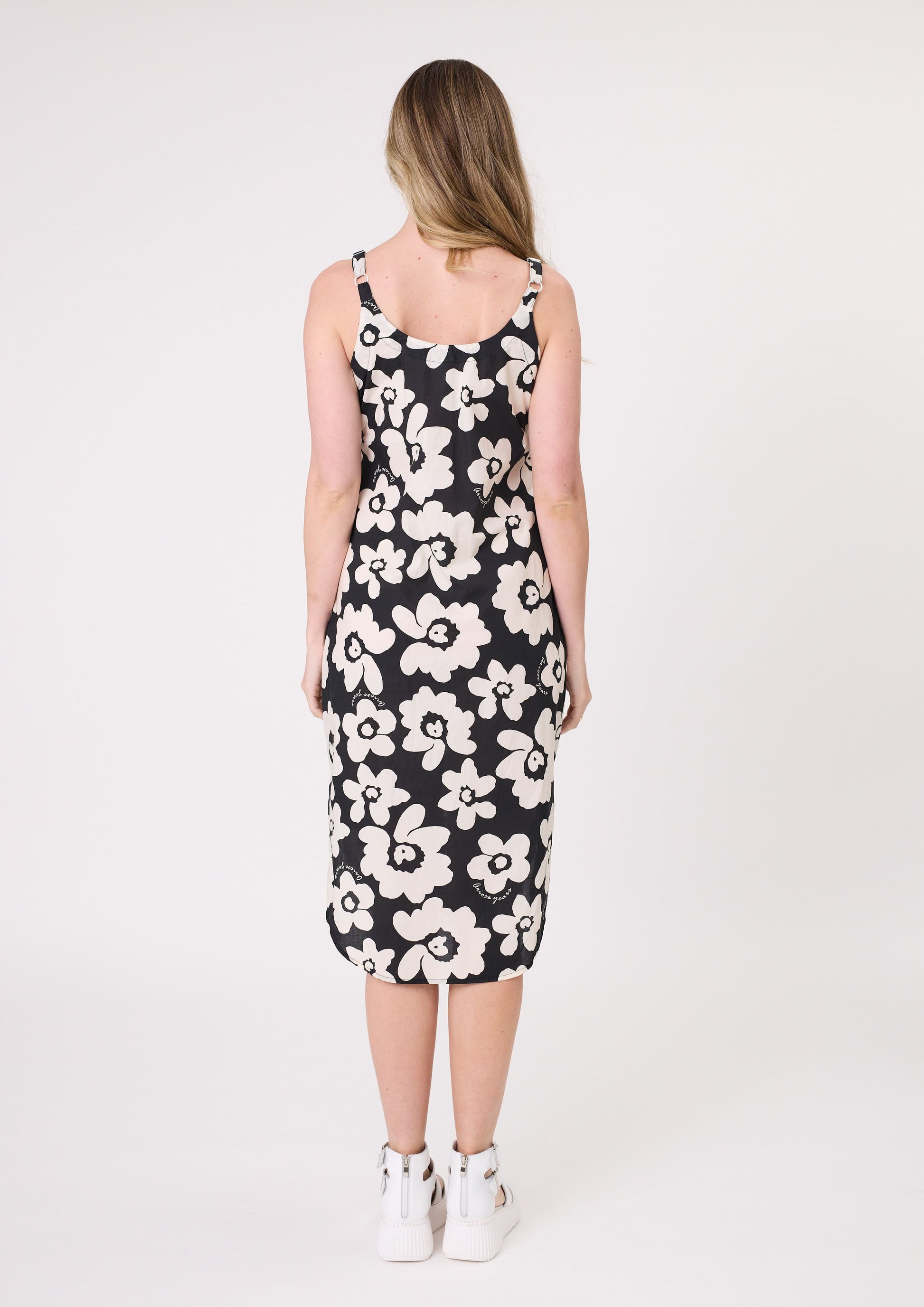 Black base with white floral print for a timeless, minimal look. Adjustable straps and a length that falls just belo...