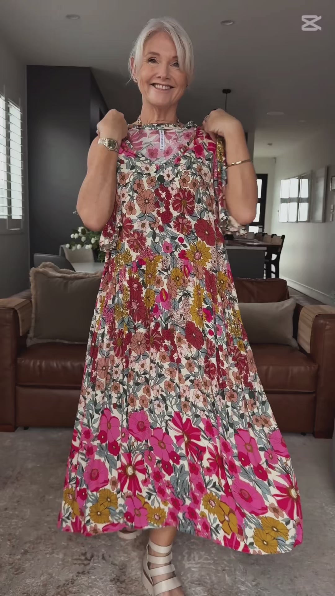 Marissa Dress with garden print, featuring a V-neckline, short sleeves, midi-length silhouette, and functional side pockets, made from a soft, breathable rayon-viscose blend.