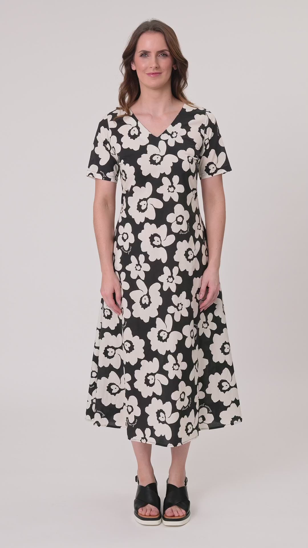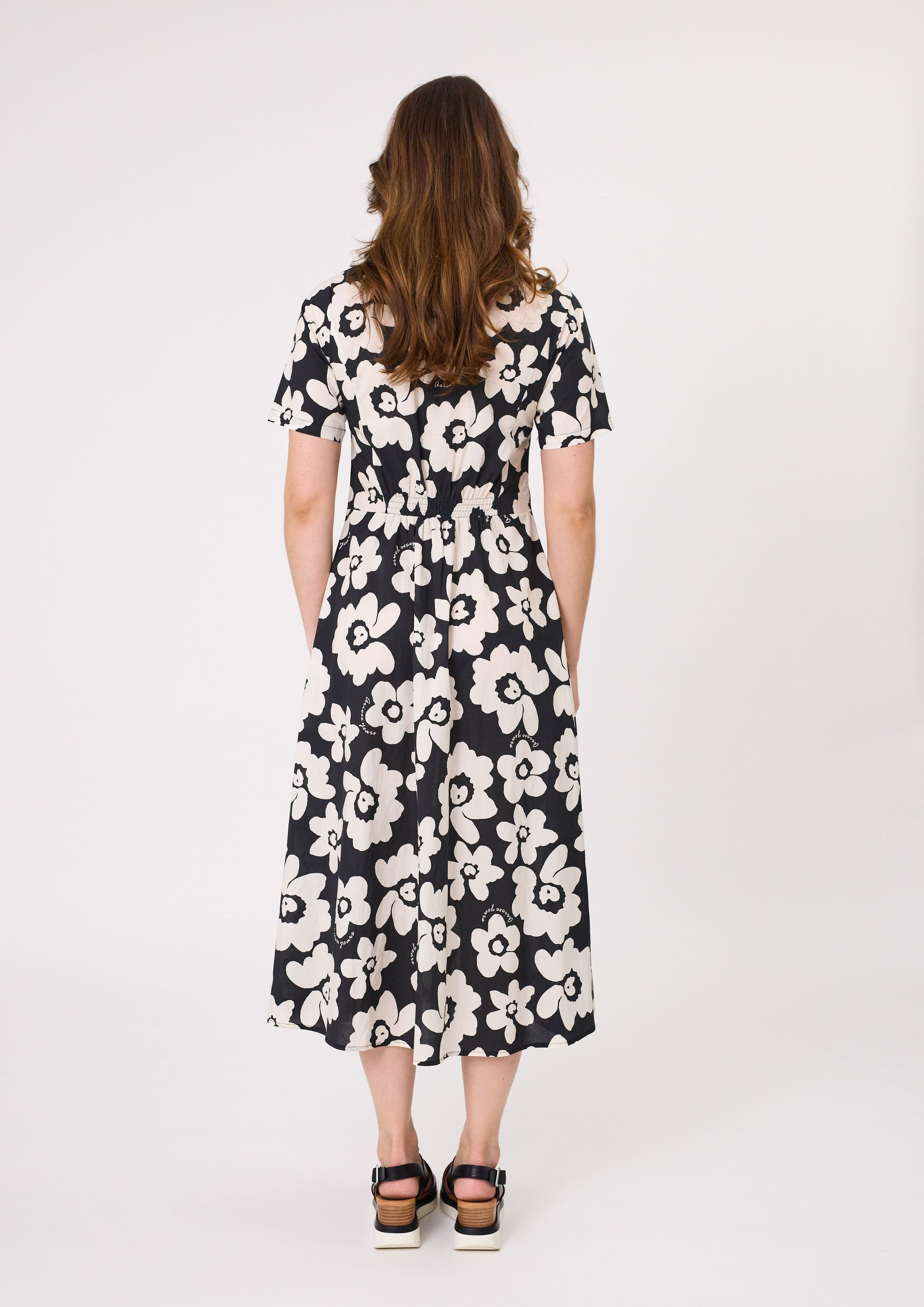 Marta Dress with a black base and white floral print, featuring a V-neckline, short sleeves, pockets, and a flattering midi length, made from 100% cotton.