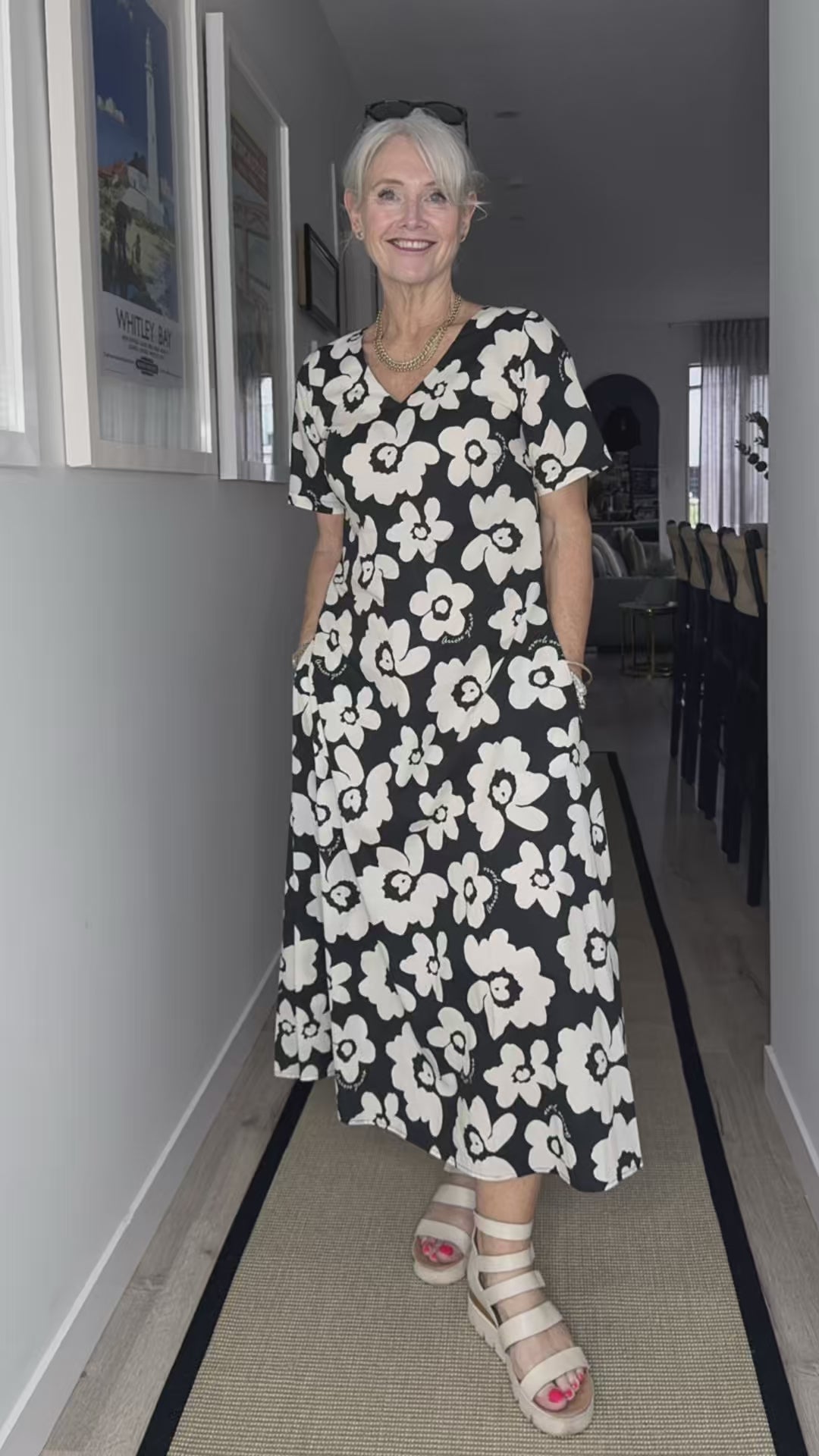 Black base with white floral print for an effortlessly classic look. Features a V-neckline, sleeves, pockets, and a ...