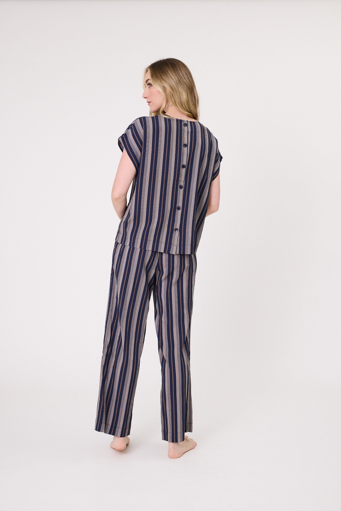 Martina Pant in navy stripe with a loose fit, side pockets, and a breezy, relaxed silhouette for casual comfort.