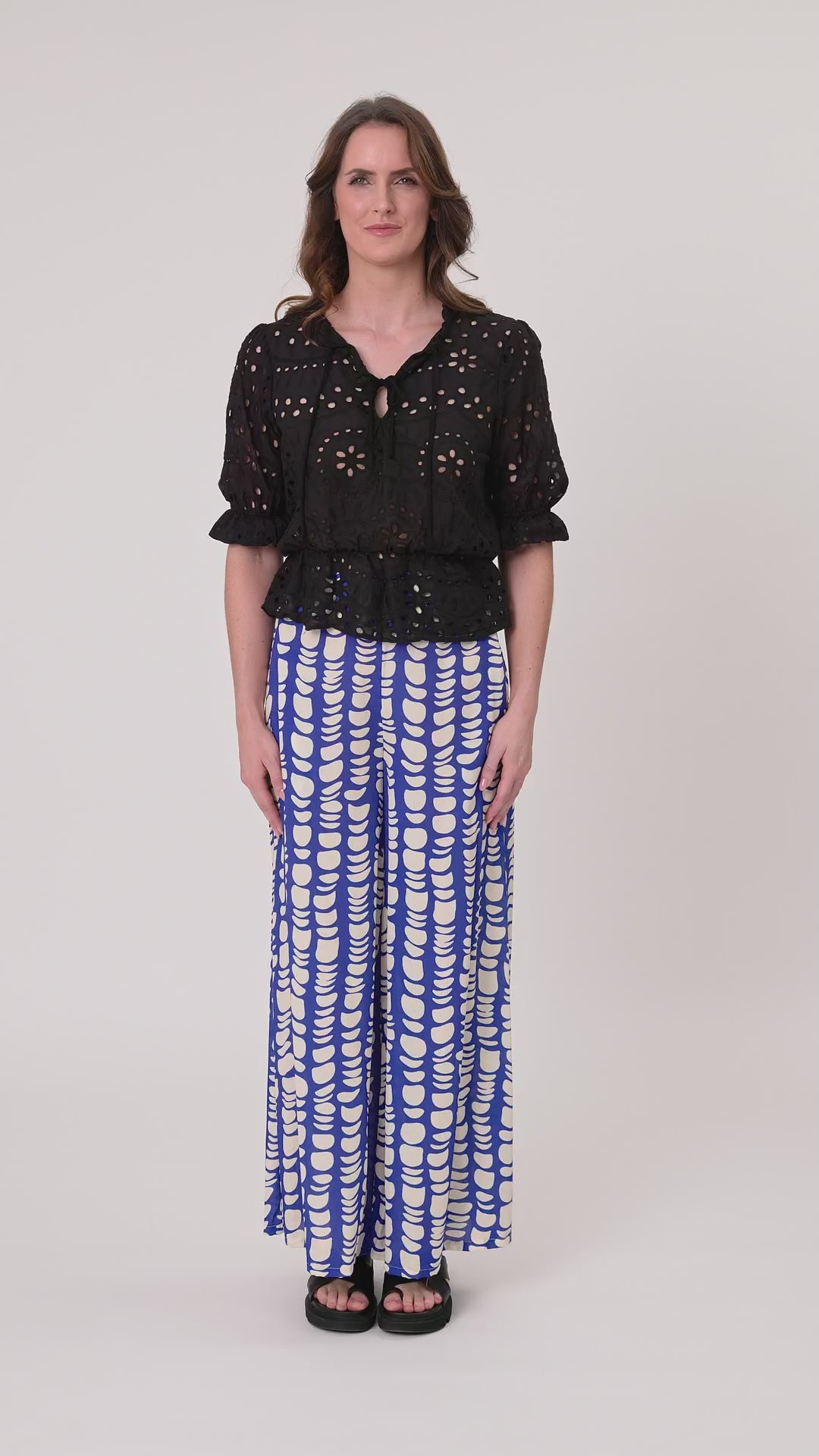 Massima Pant in cobalt blue and white print with a wide-leg silhouette, flowy drape, and practical pockets, made from a soft, breathable rayon-viscose blend.