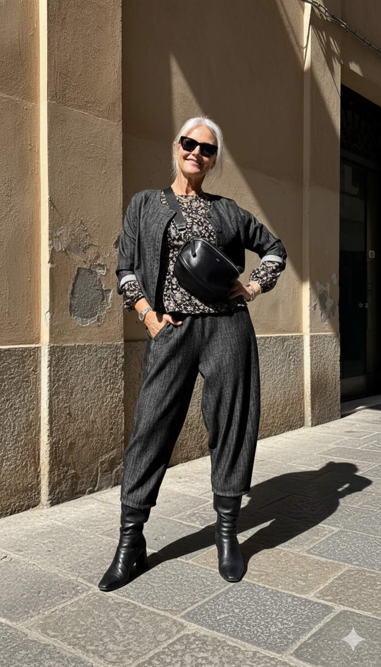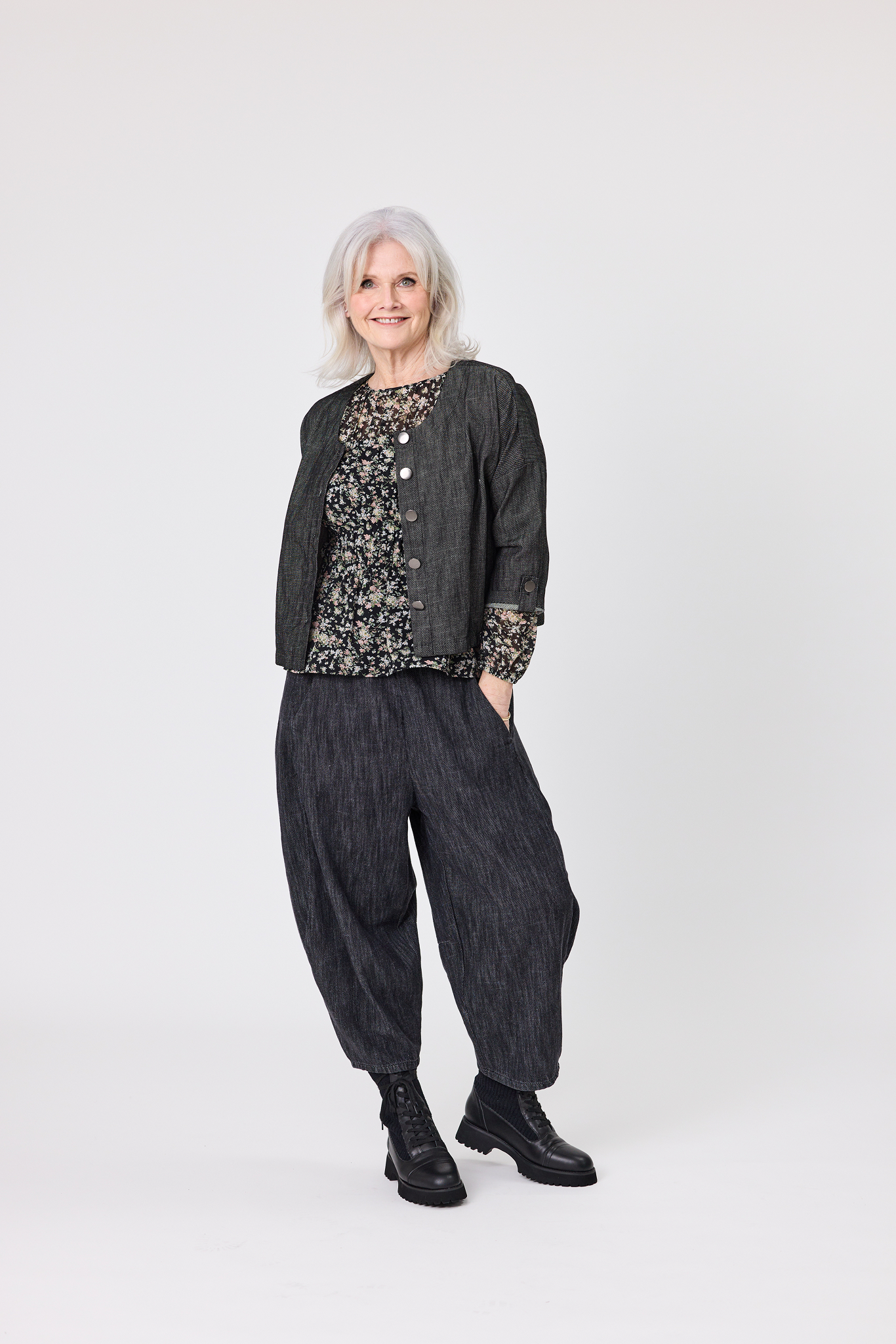• A cropped, relaxed jacket with a round neckline and an easy, slightly boxy fit. • It