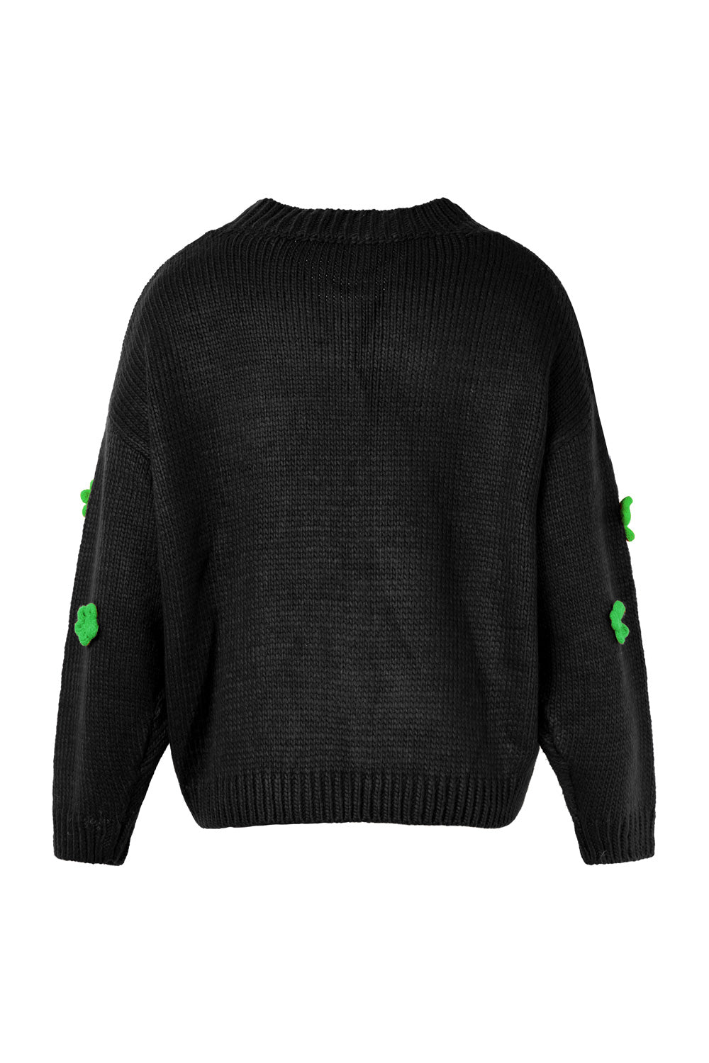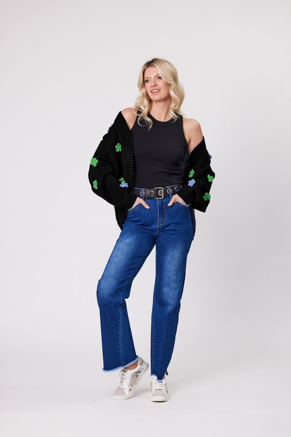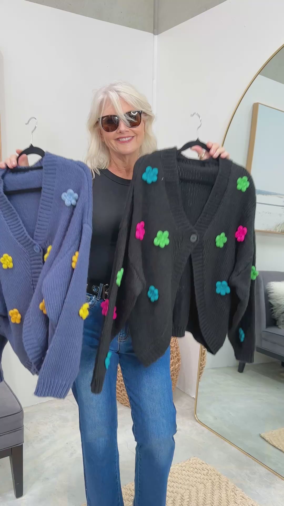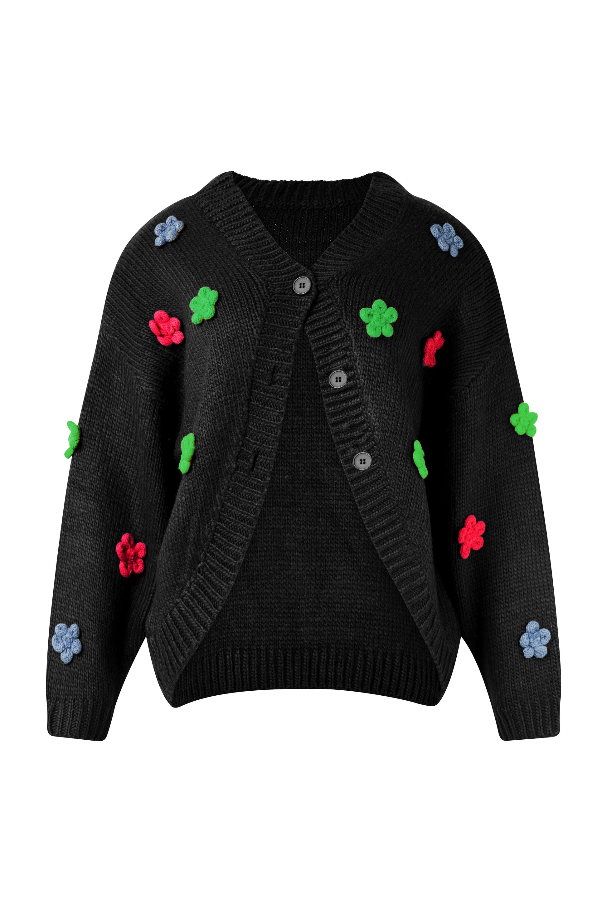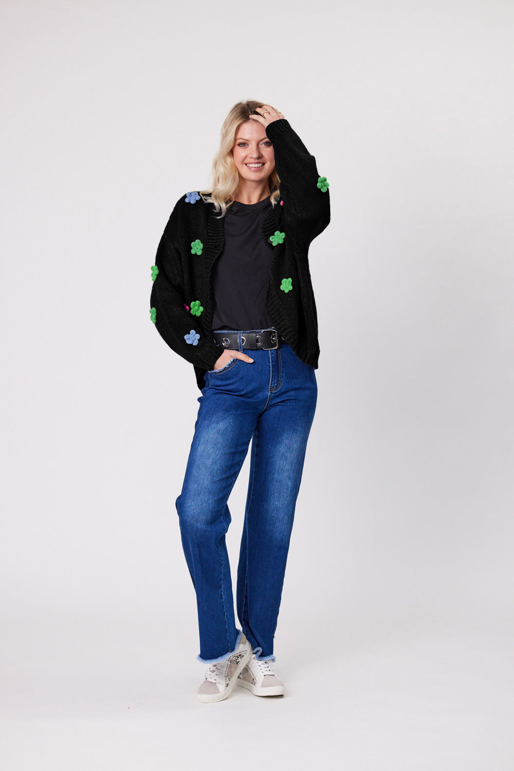 Slouchy, loose cardigan for a relaxed, comfortable fit. Knitted flower applique details for a unique, feminine touch...