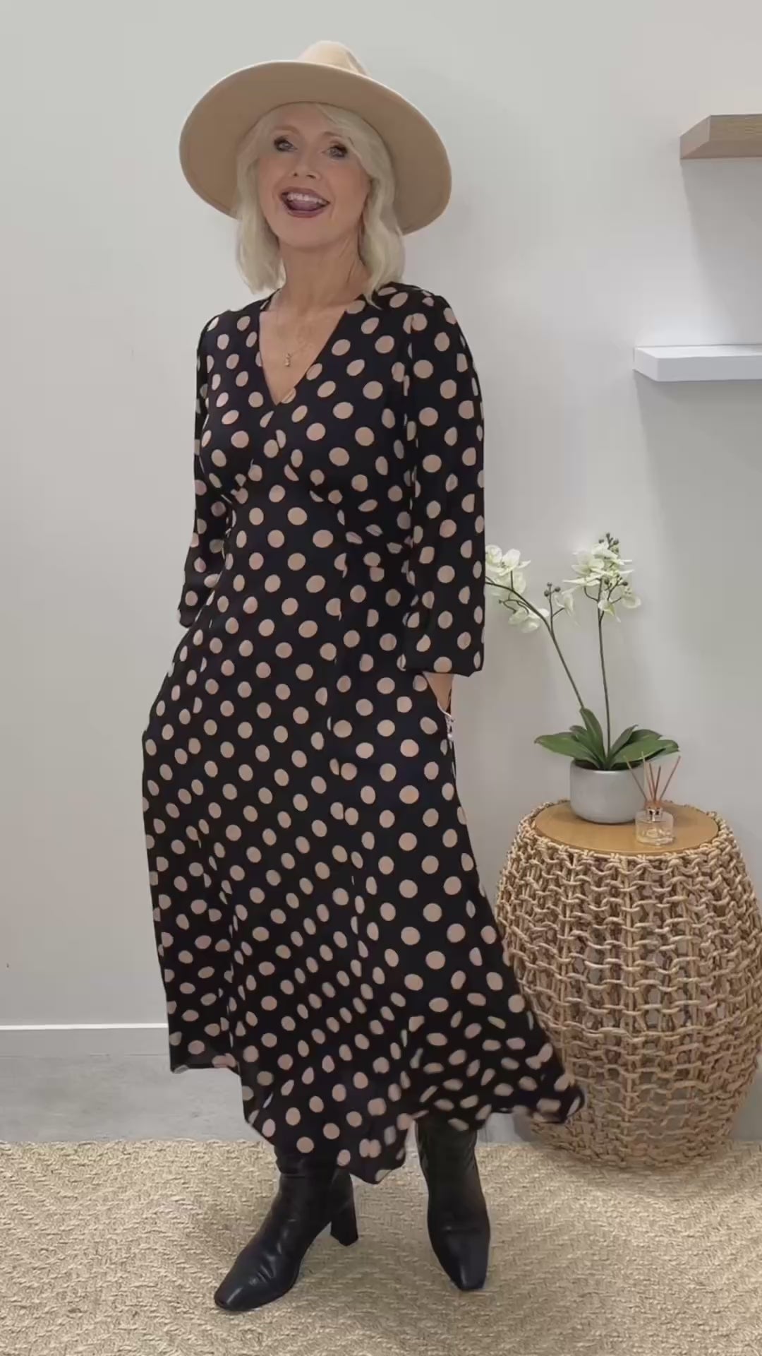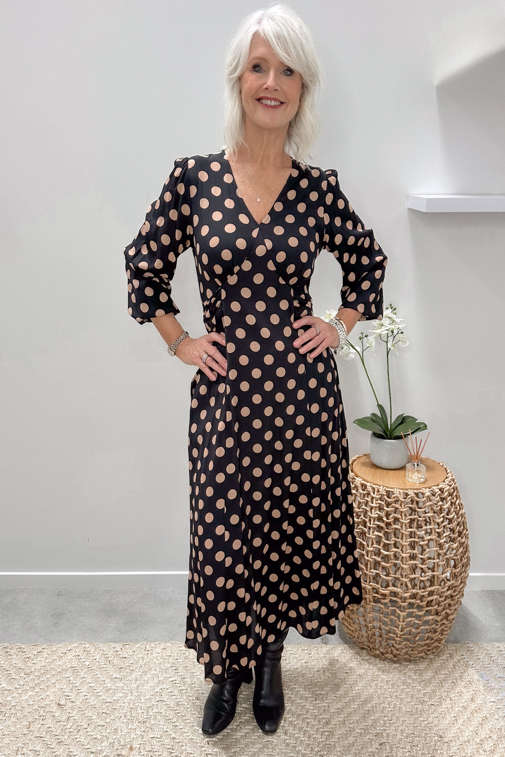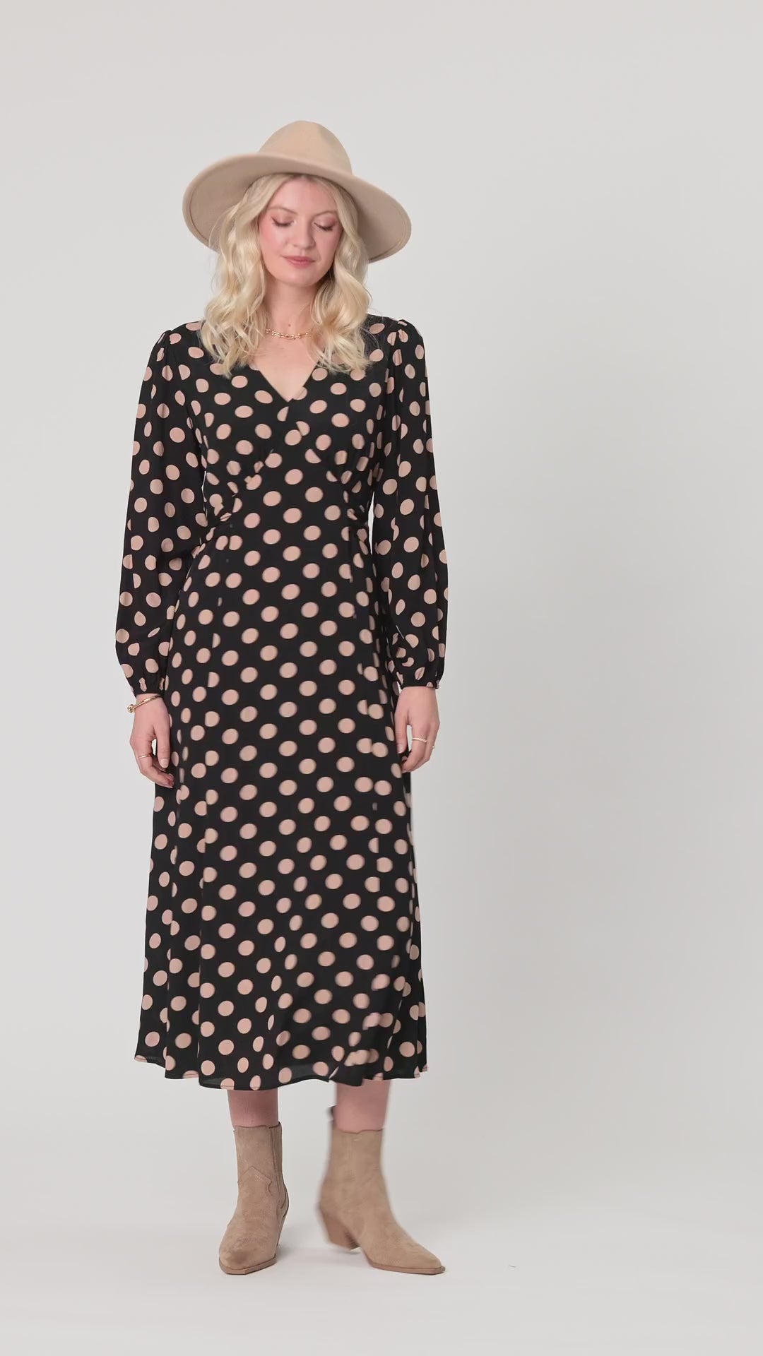 The Sabrina Dress in Latte Polkadot is your go-to piece for timeless, versatile style. Whether you're heading to work, meeting friends for coffee, or dressing up for a night out, this dress moves seamlessly with you.
