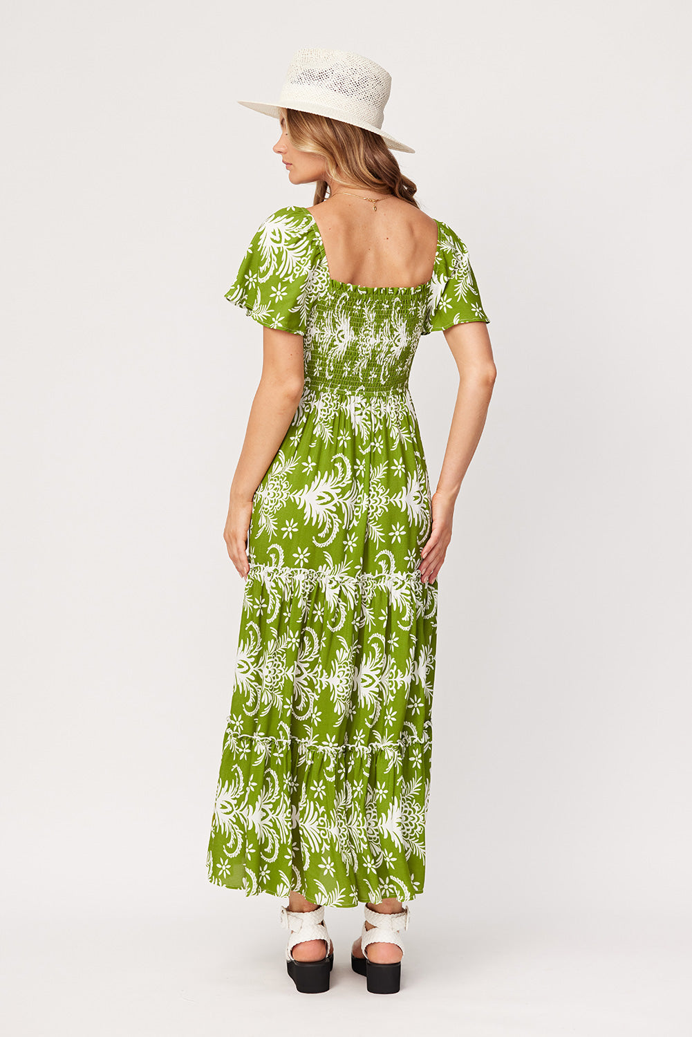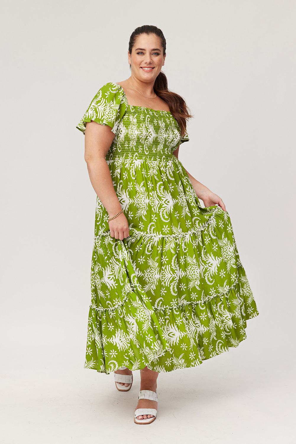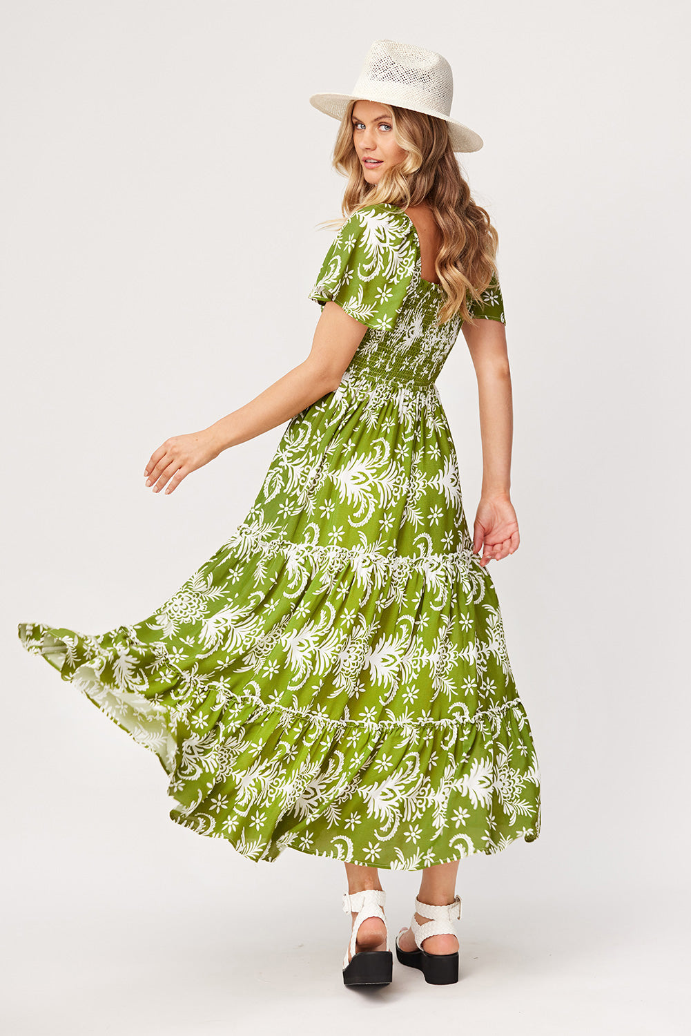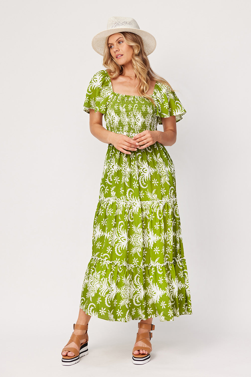 Stand out on warmer days with this striking and vibrant print dress made from a blend of soft viscose. The smock-style bodice is designed for a flattering fit, with a feminine square neckline and gathered short sleeves. The tiered midi skirt is beautifully gathered to give some movement to the look.