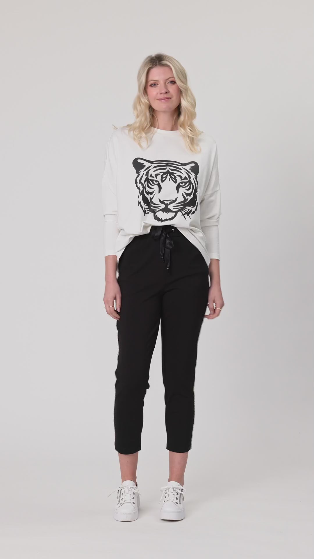 Bold yet effortlessly wearable. The Tiger Top in white features a striking black and white print on a soft, floaty fabric that moves with you. Designed with a relaxed silhouette, round neckline, and easy drape for everyday comfort and impact.
