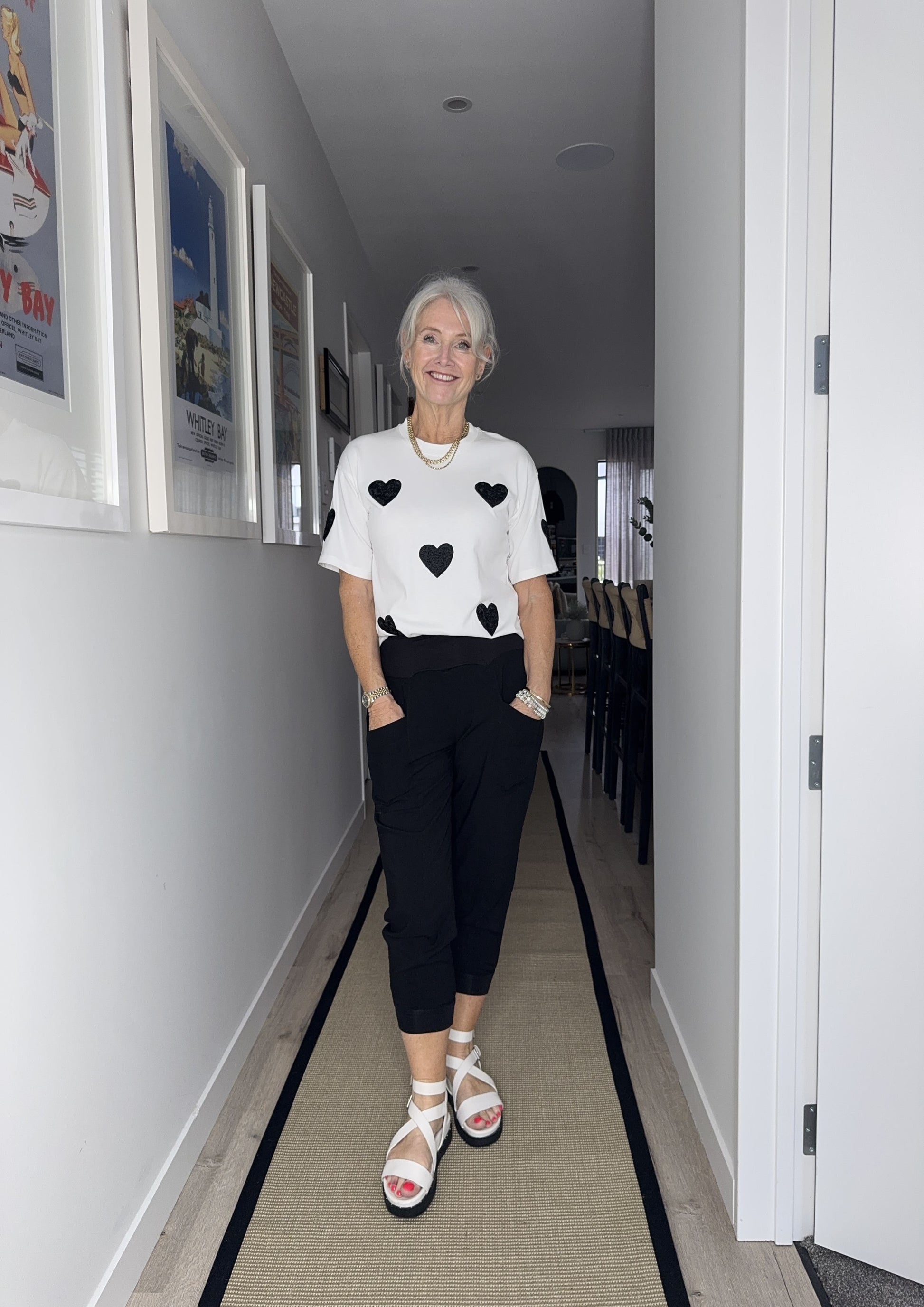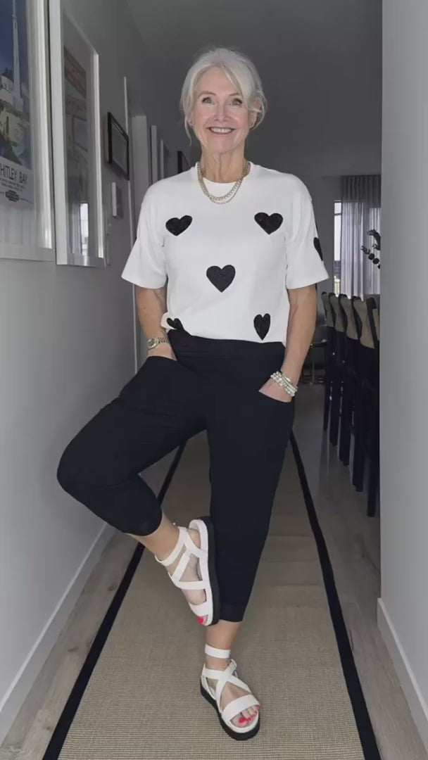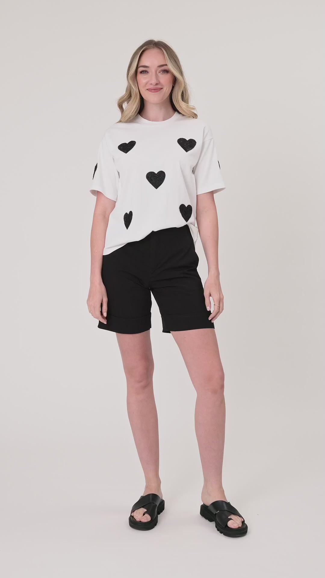 Valentina Tee in white with black heart appliqué detail, classic short-sleeve design, made from 100% cotton for soft, breathable comfort.